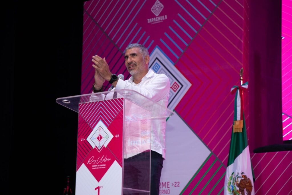 En presencia del secretario de Obras Públicas, Ángel Carlos Torres Culebro, quien acudió en representación del gobernador Rutilio Escandón Cadenas, de todos los integrantes del Cabildo, diputados locales, funcionarios públicos de los tres niveles de gobierno, autoridades militares, dirigentes empresariales, de organismos de profesionistas y de la sociedad civil, así como de partidos políticos, dejó establecido que a un año de iniciada la actual administración “se cuenta con mejor conectividad, mayores servicios, con seguridad y calidad de vida, pero, sobre todo, hoy se respira en Tapachula un ambiente de confianza, de armonía y de esperanza”.