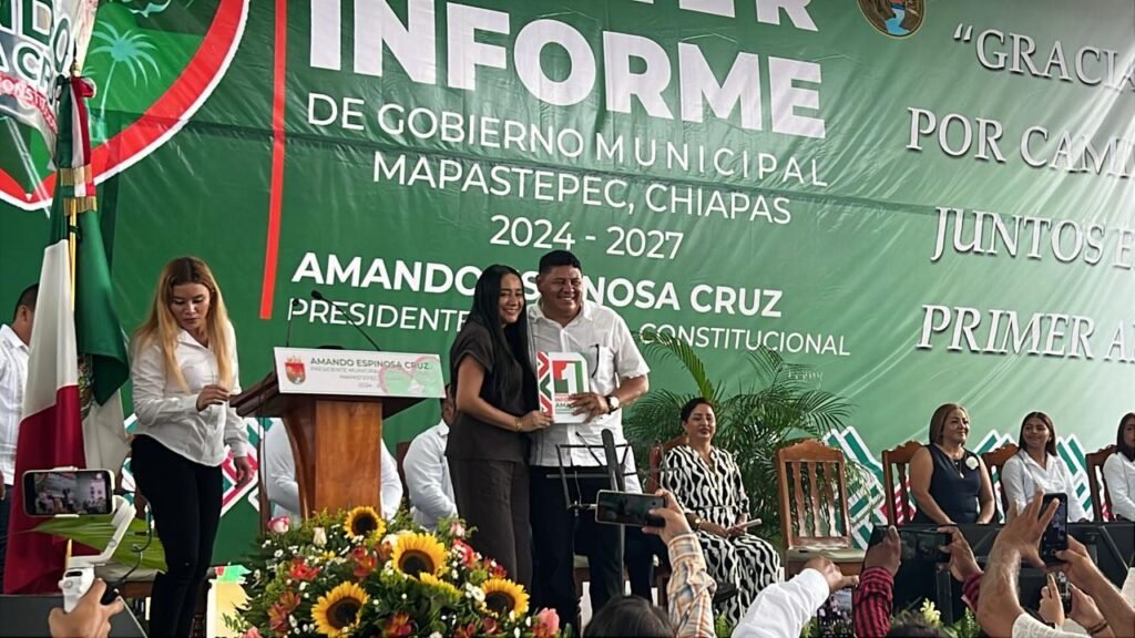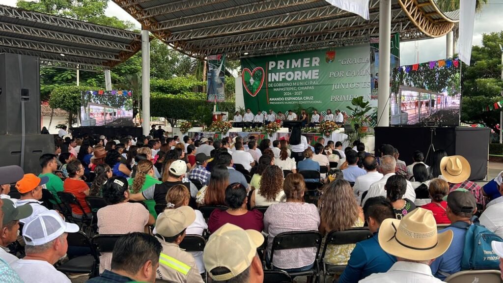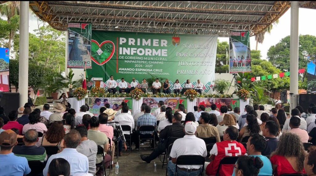 El Presidente de Mapastepec, Amando Espinosa Cruz presentó el primer informe de gobierno en el parque central Benito Juárez ante la población que se dió cita en el acto solemne.