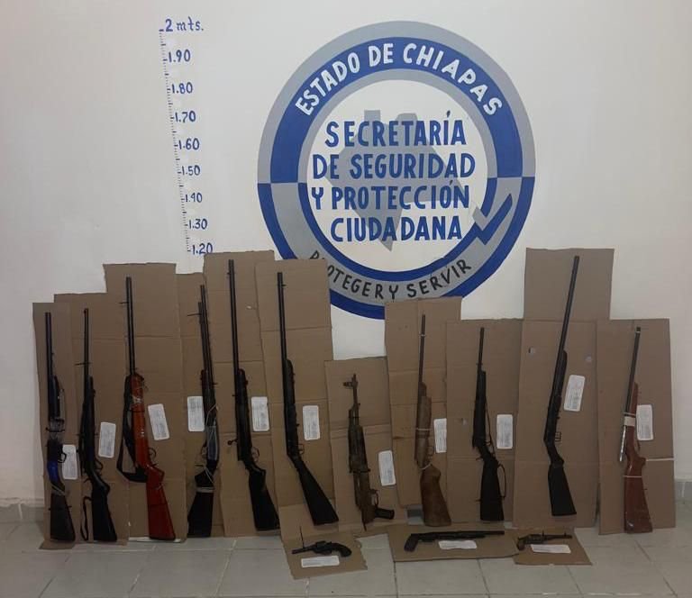 En el lugar fueron asegurados 14 armas de fuego (12 armas largas y 2 armas cortas), así como 9 cartuchos útiles de diversos calibres.