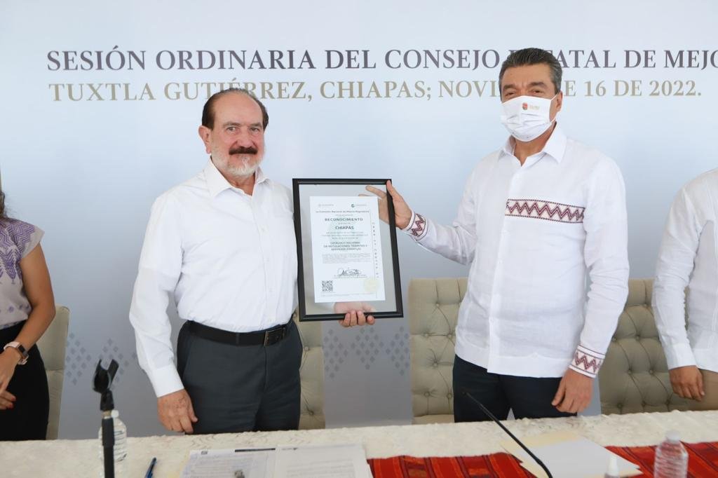 Luego de compartir sus reflexiones sobre los avances en materia de regulación en México, el comisionado nacional de Mejora Regulatoria, Alberto Montoya Martín del Campo, otorgó un reconocimiento al Gobierno de Chiapas por finalizar la carga de información en el Catálogo Nacional de Regulaciones, Trámites y Servicios (CNARTyS), y celebró esta convocatoria que concentra a los tres órdenes de gobierno, actores económicos y sectores sociales.