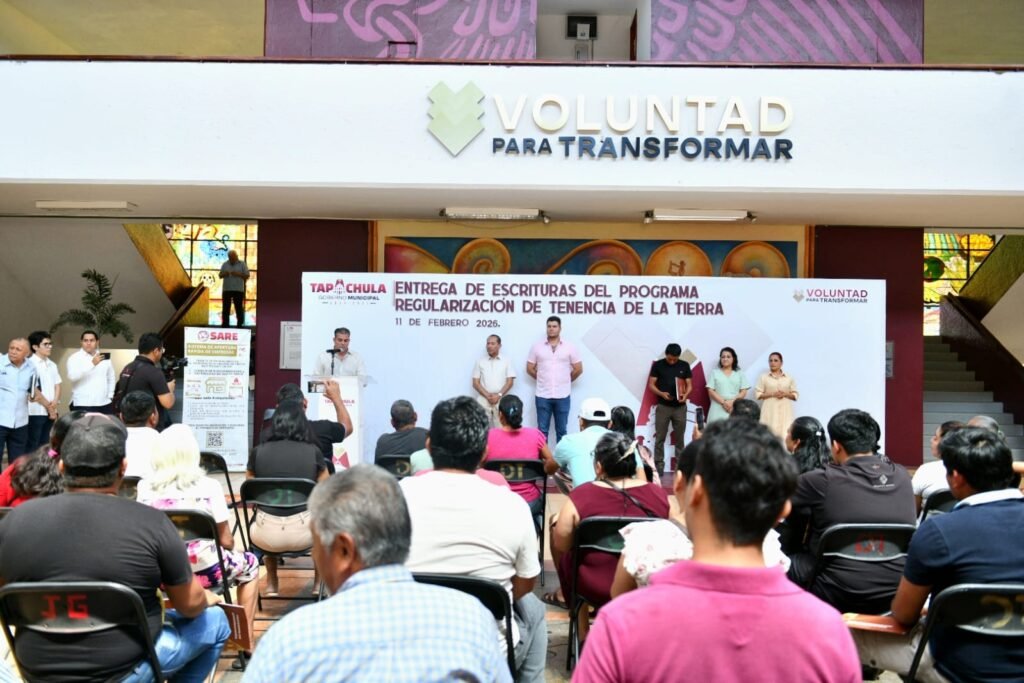 11 de febrero 2026, Tapachula, Chiapas.- Treinta y dos familias de once colonias de Tapachula, recibieron este día las escrituras de su propiedad con lo que se garantiza certeza jurídica y patrimonial, además de seguridad de un futuro mejor, destacó el presidente municipal, Yamil Melgar Bravo al presidir la entrega como parte del Programa de Regularización de la Tenencia de la Tierra.