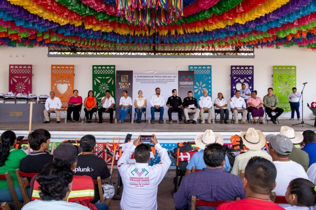 Tuxtla Chico, Chiapas a 24 de marzo de 2026. Por una Protección Civil más sólida, humanista, preventiva, participativa y siguiendo las políticas públicas del Gobernador Eduardo Ramírez Aguilar, el presidente Municipal de Tuxtla Chico, Julio Enrique Gamboa Altúzar y el secretario de PC estatal, Mauricio Cordero Rodríguez, realizaron la entrega de equipo y herramientas, material prehospitalario y uniformes, fortaleciendo una vez más la Unidad de Protección Civil Municipal.