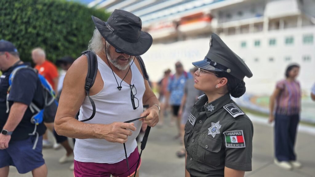 La Secretaría de Seguridad del Pueblo (SSP) a través de la Subsecretaría Vial Preventiva y de Turismo, brindó seguridad y acompañamiento a pasajeros del crucero Emerald Princess, proveniente de Huatulco, Oaxaca, en su visita a los destinos turísticos de los municipios de Tapachula y Tuxtla Chico, en el estado de Chiapas.