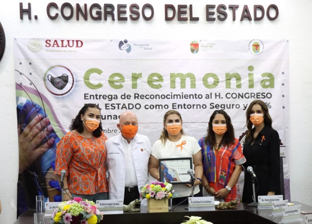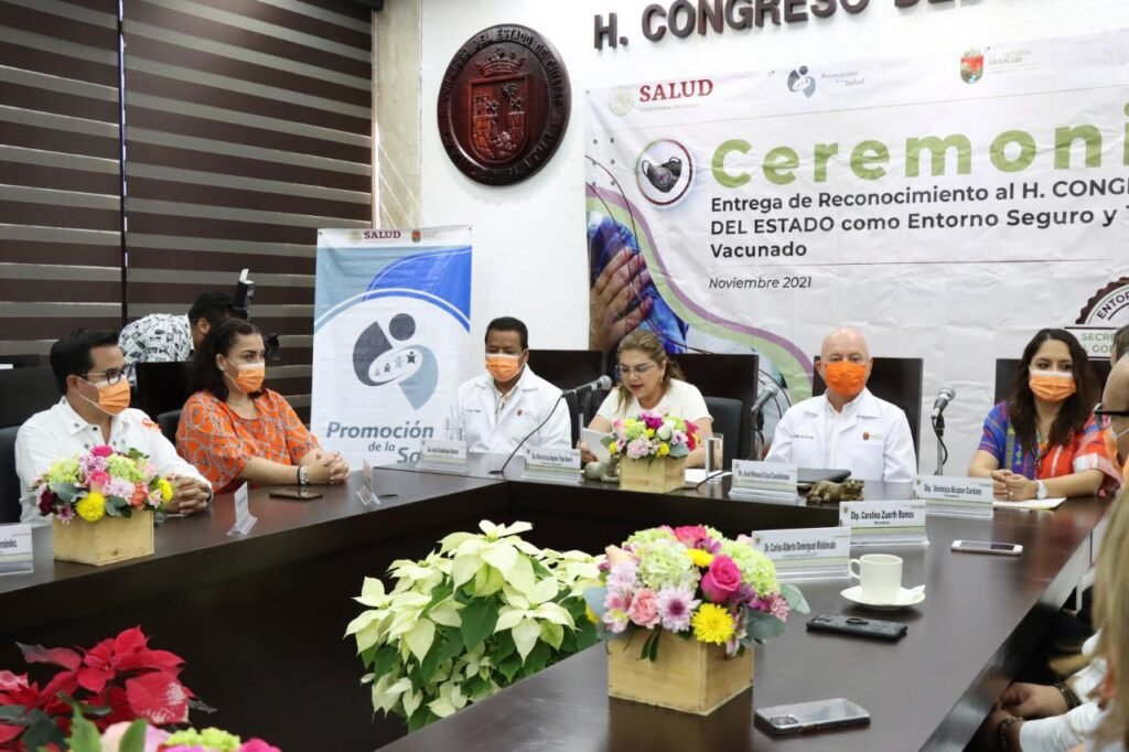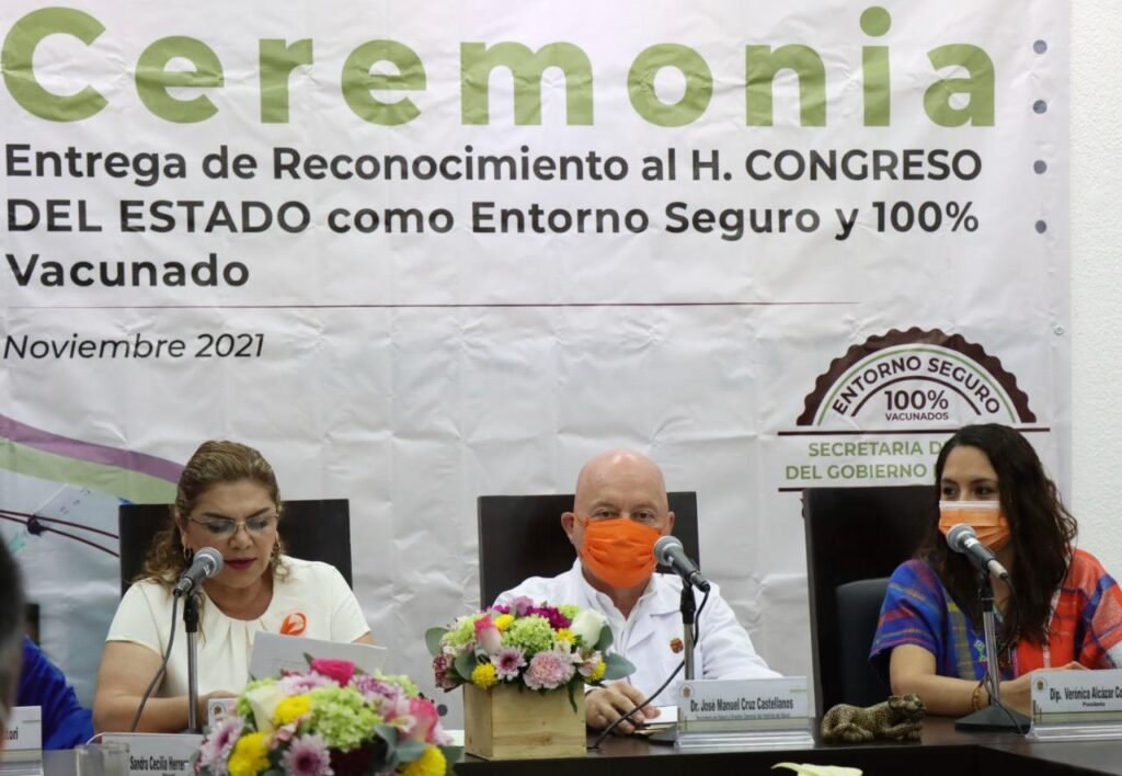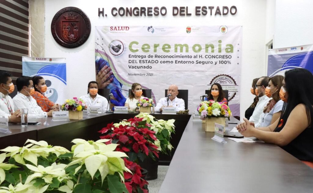Tuxtla Gutiérrez, Chiapas; 25 de noviembre de 2021.- El secretario de Salud del estado, doctor Pepe Cruz, hizo entrega del reconocimiento como Entorno Seguro y 100 por ciento vacunado al Congreso del Estado, por cumplir con la aplicación del protocolo de seguridad sanitaria en sus instalaciones y la protección de su personal con la vacuna contra COVID-19, como parte de las acciones de la estrategia Casa por Casa y Negocio por Negocio.