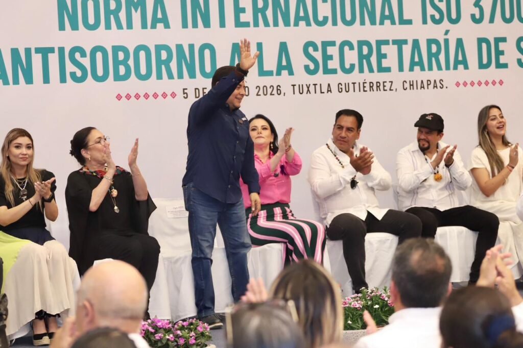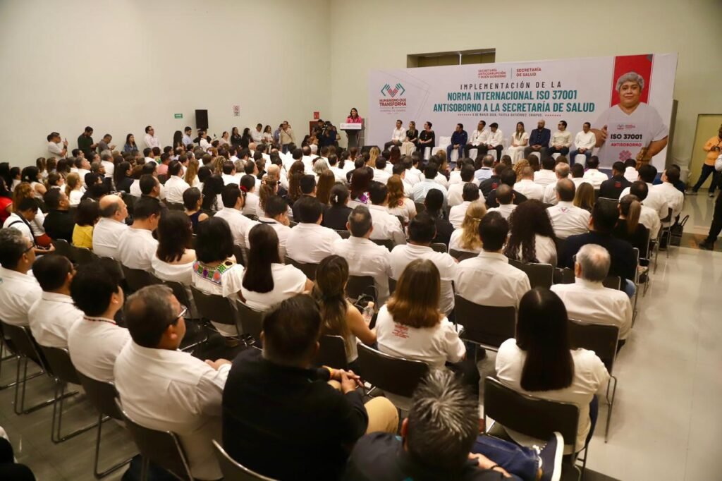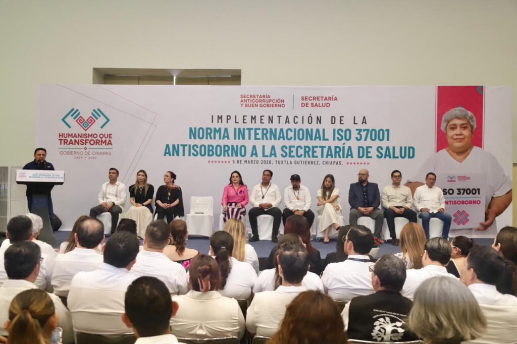 El magistrado presidente del Poder Judicial del Estado de Chiapas, Juan Carlos Moreno Guillén, participó en la ceremonia de implementación de la Norma Internacional ISO 37001 Antisoborno a la Secretaría de Salud del Estado, en un acto encabezado por el gobernador Eduardo Ramírez Aguilar, junto a la secretaria de Anticorrupción y Buen Gobierno, Ana Laura Romero Basurto, y el secretario de Salud, Omar Gómez Cruz, en las instalaciones del Polyforum Chiapas.