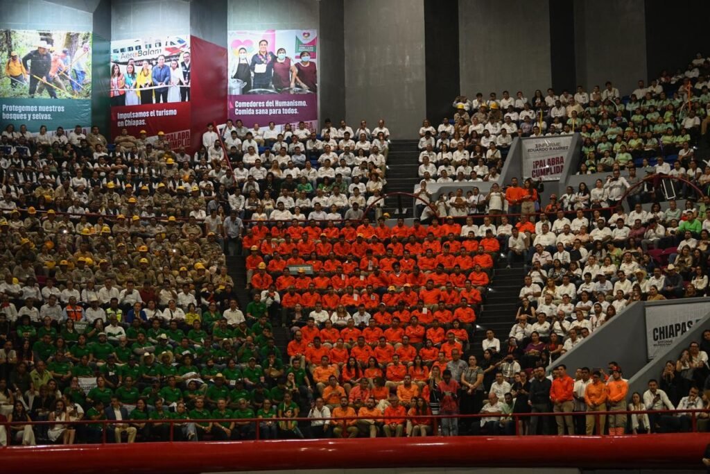 También estuvieron presentes integrantes del Gabinete Legal y Ampliado; diputadas y diputados locales y federales; senadoras y senadores; representantes del Poder Judicial; presidentas y presidentes municipales; personal de Vectores de la Secretaría de Salud; combatientes de incendios de Protección Civil; alfabetizadores del programa Chiapas Puede; transportistas; guías de turismo; deportistas de alto rendimiento; elementos de la Guardia Estatal, Policía Ministerial y Fuerza de Reacción Inmediata Pakal; representantes de pueblos originarios; cámaras empresariales, colegios y asociaciones profesionales; así como medios de comunicación, entre otros.