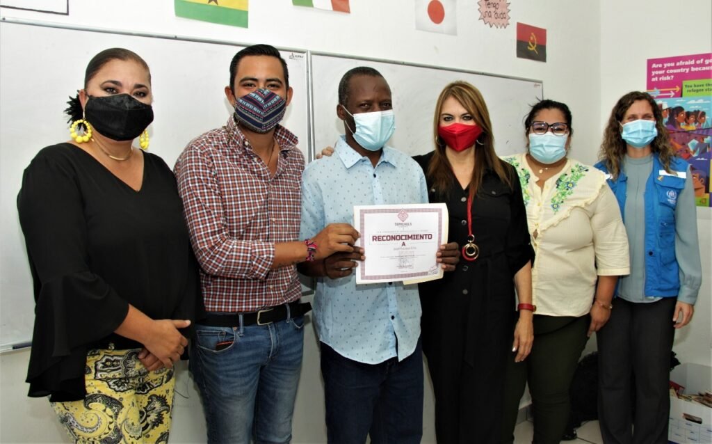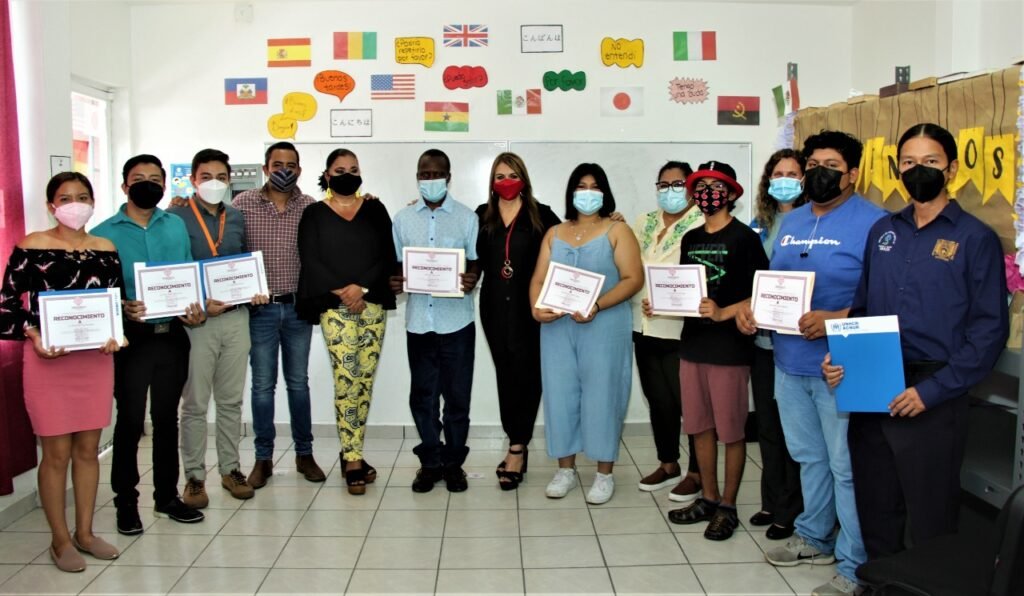Tapachula, Chiapas.- Jóvenes mexicanos, refugiados y solicitantes de asilo culminaron el curso de idiomas 2021 impartido por el Ayuntamiento de Tapachula a través de la Secretaría de la Juventud y Deportes en coordinación con la Escuela de Lenguas de la Universidad Autónoma de Chiapas, otorgándoles los respectivos diplomas.