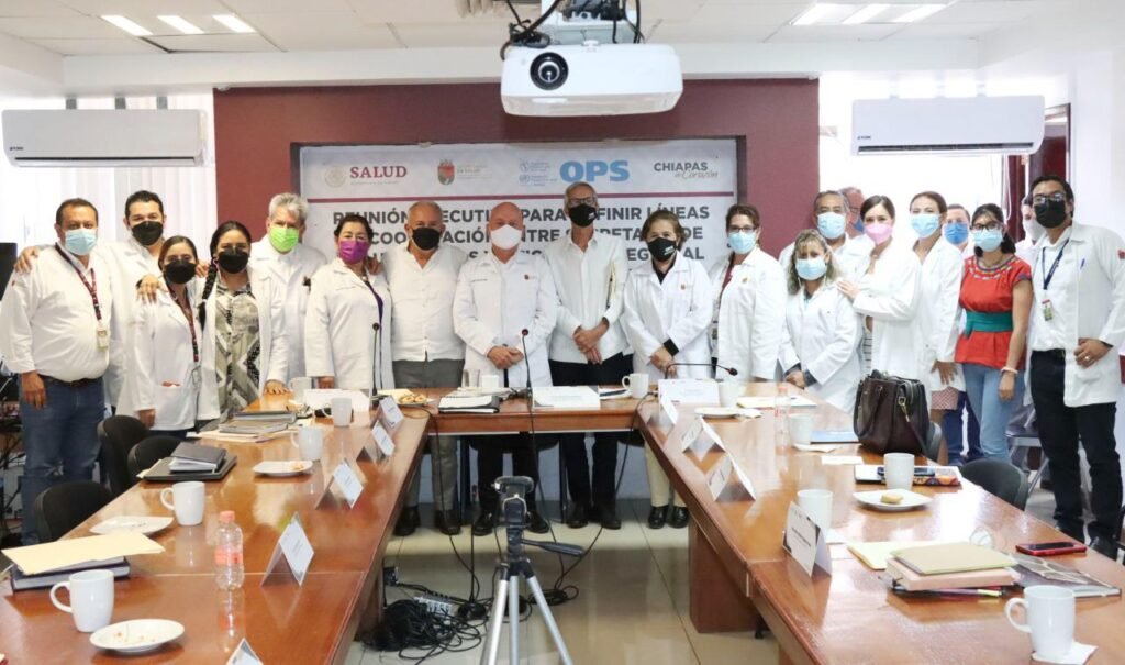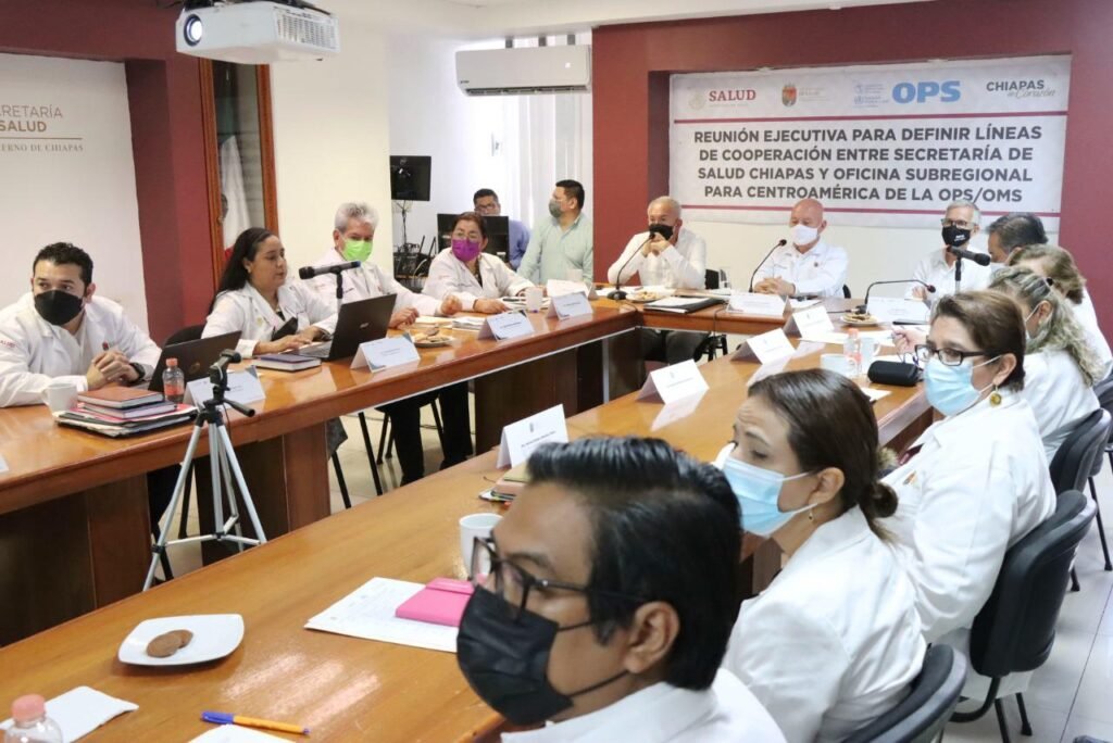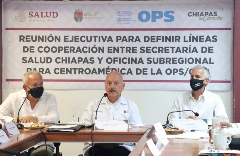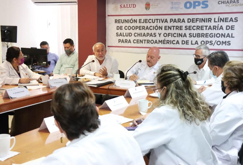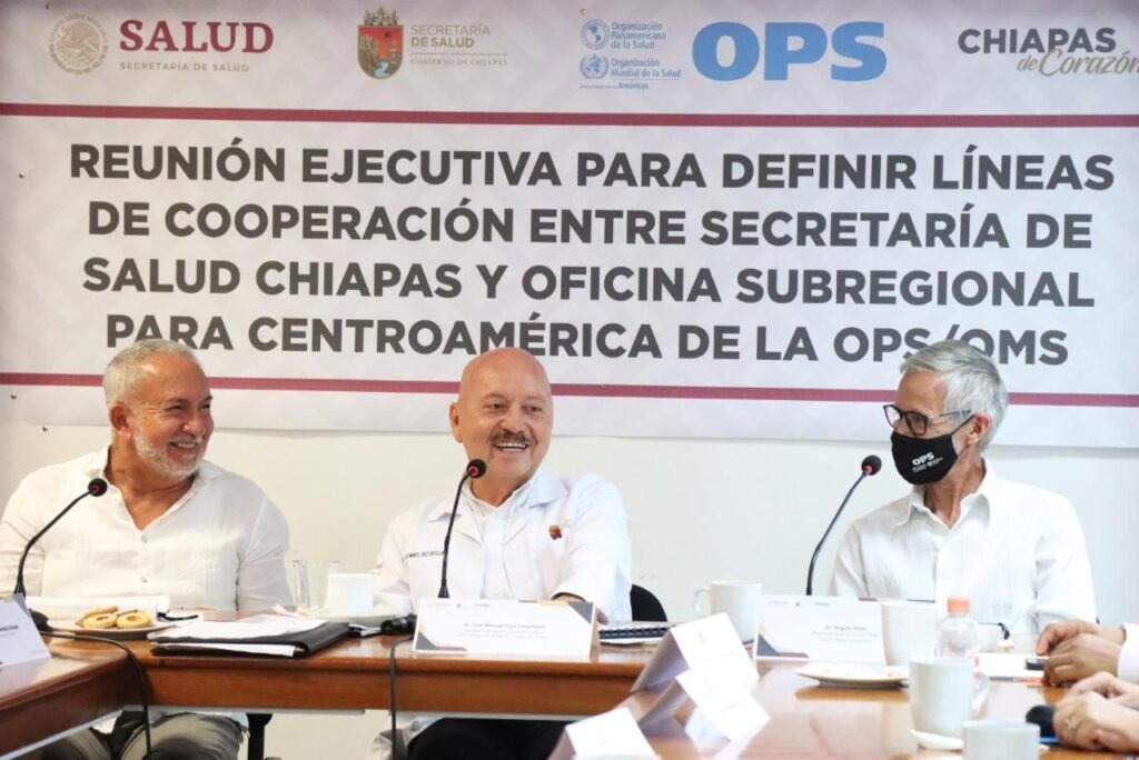 Tuxtla Gutiérrez, Chiapas; 11 de julio de 2022.- Para definir las líneas de cooperación entre la Secretaría de Salud de Chiapas y la Oficina Subregional para Centroamérica de la Organización Panamericana y Mundial de la Salud (OPS/OMS), con miras a consolidar las acciones enfocadas a la atención de la salud de la población chiapaneca y migrante, el titular de la dependencia estatal, doctor Pepe Cruz, sostuvo una reunión ejecutiva con autoridades del organismo internacional.