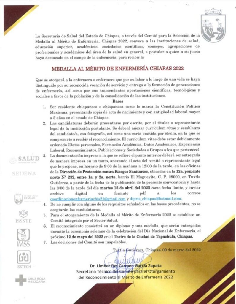 Tuxtla Gutiérrez, Chiapas; marzo de 2022.- La Secretaría de Salud del estado convoca a todas las instituciones de salud, de educación superior, academias, sociedades científicas, consejos, agrupaciones de profesionales y académicos del área de la salud en general, para que postulen a la enfermera o enfermero que destaque en ese campo por su labor diaria, para recibir la Medalla al Mérito de Enfermería 2022.