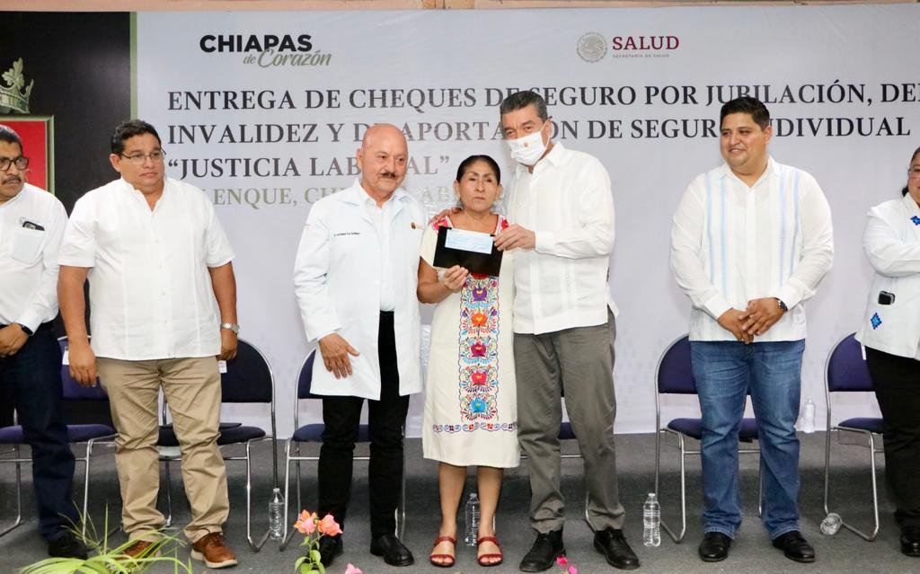 En el municipio de Palenque, el gobernador Rutilio Escandón Cadenas entregó al personal de salud cheques de seguro por jubilación, defunción, invalidez y de aportación de seguro individual, con lo que se hace justicia laboral a las trabajadoras y trabajadores de este sector que han puesto su vocación y profesionalismo al servicio del pueblo chiapaneco.