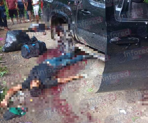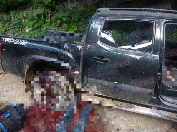 Dos cuerpos se observan sobre la góndola del vehículo y cuatro más tirados en un camino de terracería junto a la misma camioneta. Sin embargo, versiones extraoficiales hablan de siete personas muertas durante el ataque armado.