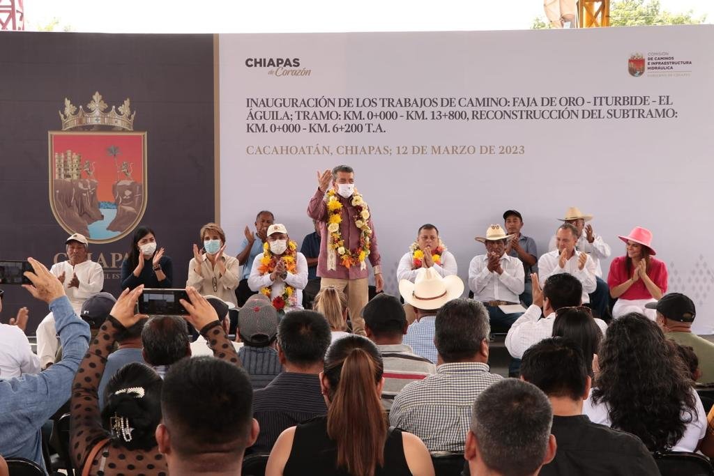 Durante la inauguración de la rehabilitación de 6.2 kilómetros del camino Faja de Oro-Iturbide-El Águila del municipio de Cacahoatán, el gobernador Rutilio Escandón Cadenas aseguró que su gobierno no bajará la guardia en el impulso de acciones que respondan a peticiones realmente sentidas de la población, como la rehabilitación y modernización de la infraestructura carretera en toda la entidad.