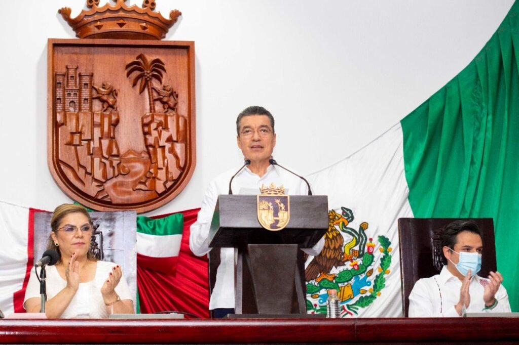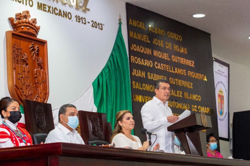 En dicho acto realizado en la sala de sesiones del Congreso del Estado, estuvo acompañado de Zoé Robledo Aburto en representación del presidente de la República Andrés Manuel López Obrador; el magistrado Juan Óscar Trinidad Palacios, presidente del Poder Judicial; y los 40 diputados que integran la Sexagésima Octava Legislatura, encabezados por la diputada María de Los Ángeles Trejo Huerta, presidenta de la Mesa Directiva y del diputado Yamil Melgar Bravo, presidente de la Junta de Coordinación Política.