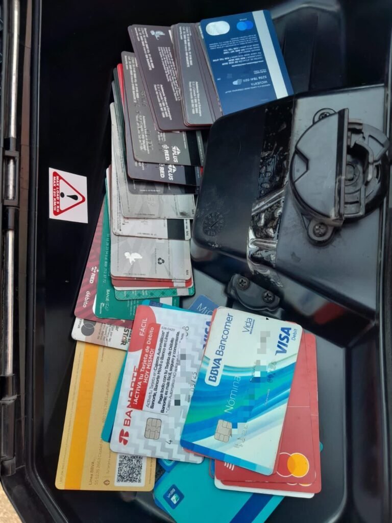 Tras efectuarle una revisión de seguridad, en apego al protocolo de actuación policial, lo hallaron en posesión 48 tarjetas bancarias de diferentes instituciones financieras, de las que no comprobó su legal propiedad, aunado a que tenían nombres de diferentes personas.