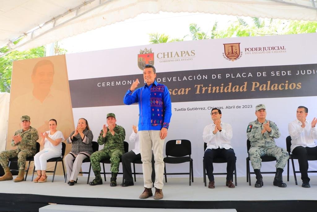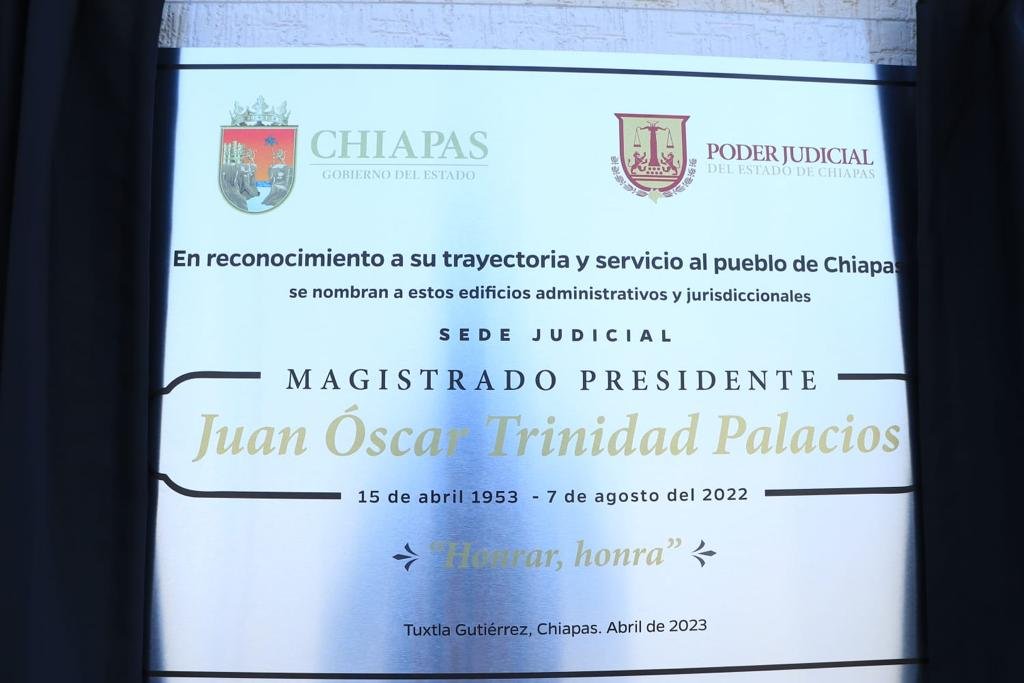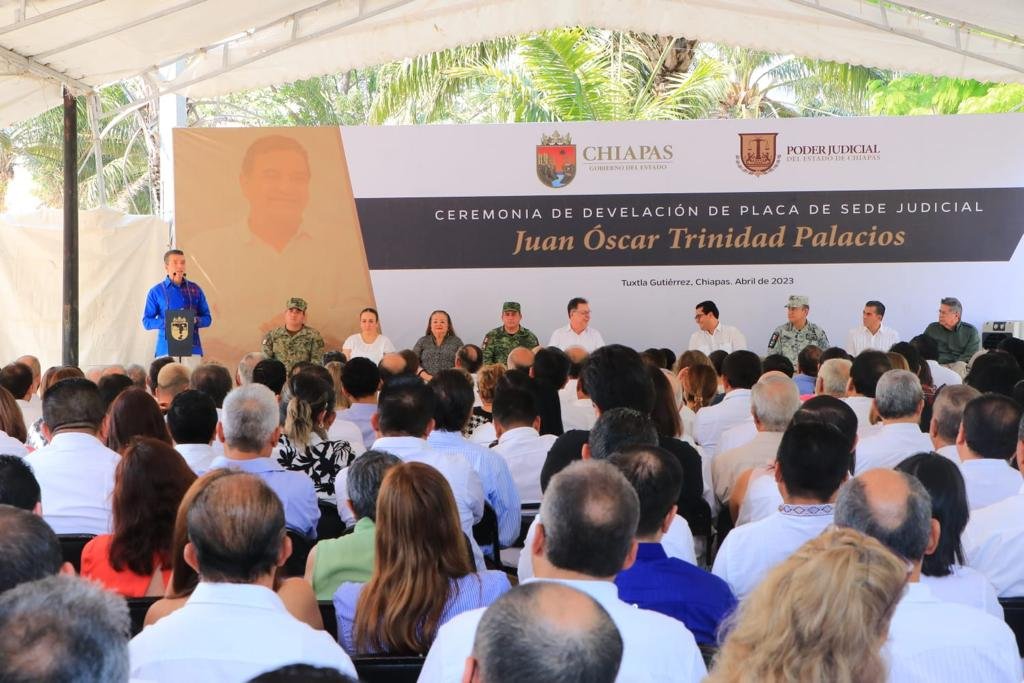 El gobernador Rutilio Escandón Cadenas participó en la ceremonia de develación de la placa de la Sede Judicial Magistrado Presidente Juan Óscar Trinidad Palacios, como reconocimiento a la trayectoria y el legado del jurista y político chiapaneco, a quien describió como un hombre extraordinario, íntegro y un servidor público ejemplar que siempre trabajó de manera firme y comprometida por los derechos humanos y la justicia en Chiapas.