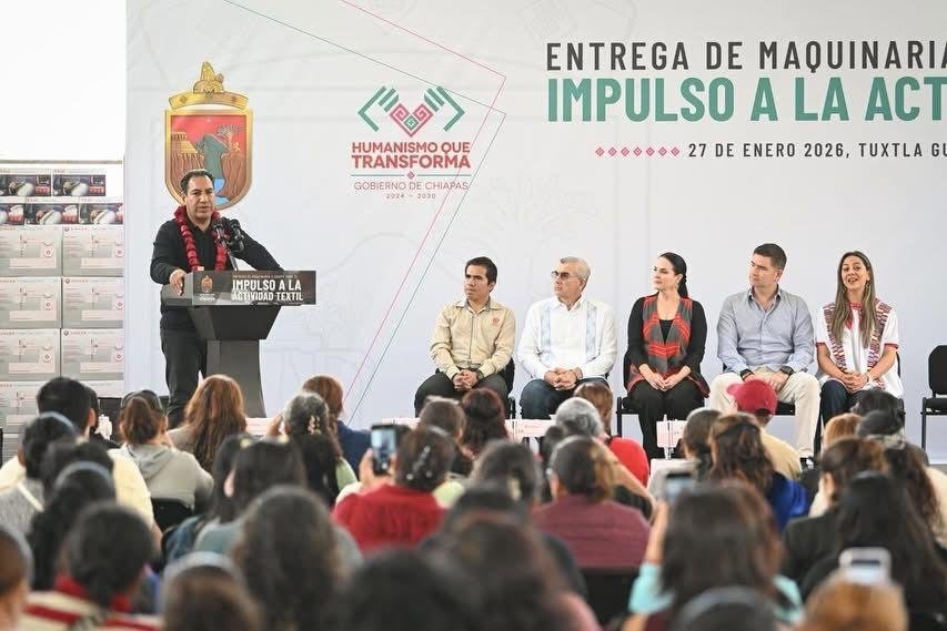 En Tuxtla Gutiérrez, el gobernador Eduardo Ramírez Aguilar encabezó la entrega de maquinaria y equipo para impulsar la actividad textil, acción que forma parte de las políticas del gobierno de la Nueva ERA orientadas al fortalecimiento del bienestar social. En este contexto, destacó que su administración se rige por la filosofía del buen vivir y los principios del humanismo, que colocan a las personas en el centro de la atención pública.