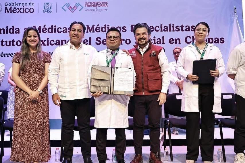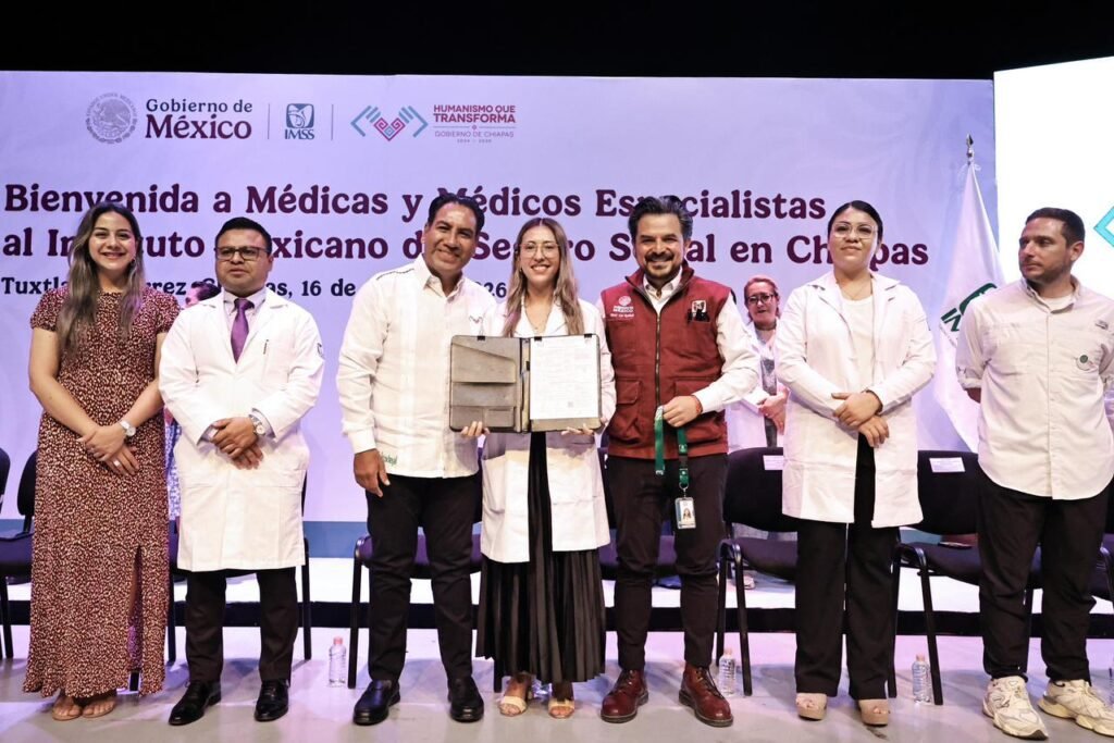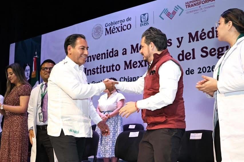 El gobernador de Chiapas, Eduardo Ramírez Aguilar, y el director general del Instituto Mexicano del Seguro Social (IMSS), Zoé Robledo, dieron la bienvenida a 371 médicos especialistas que se incorporan a laborar en hospitales de la institución en zonas urbanas y rurales, quienes fueron contratados en la jornada de reclutamiento 2026 para fortalecer la atención médica de alta especialidad en el estado.