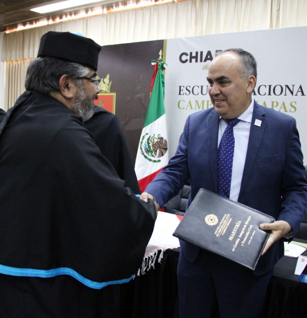 En la Escuela Nacional de Protección Civil Campus Chiapas (Enaproc-Chiapas), se lleva a cabo la toma de protesta a maestros y maestras en Gestión Integral de Riesgos y Protección Civil, aprobados por la modalidad del 50 por ciento de estudios de nivel doctorado y de alumnos de la Licenciatura en Protección Civil.