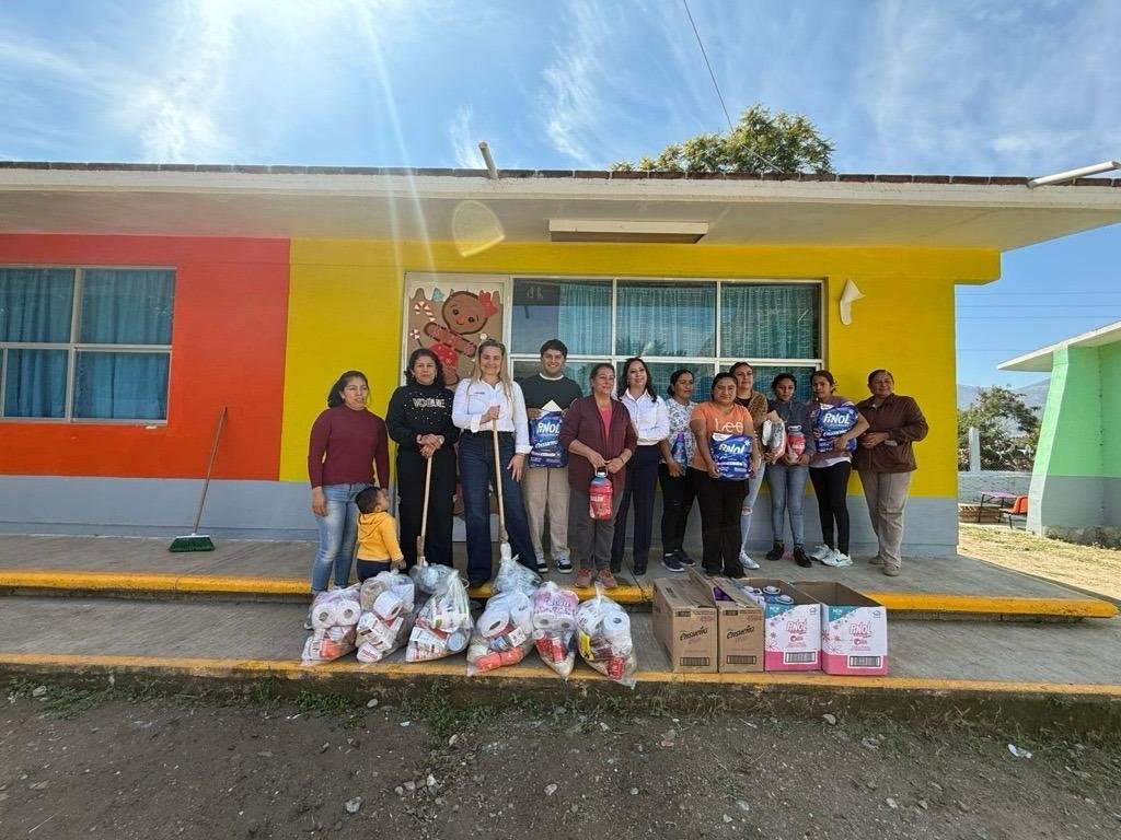 La donación incluyó artículos esenciales para la desinfección de hogares y espacios públicos, entre ellos limpiador multiusos, detergente en polvo, suavizante de telas y cloro, productos clave para prevenir riesgos sanitarios tras el fenómeno meteorológico que dejó graves daños en la sierra alta y zona Otomí-Tepehua.