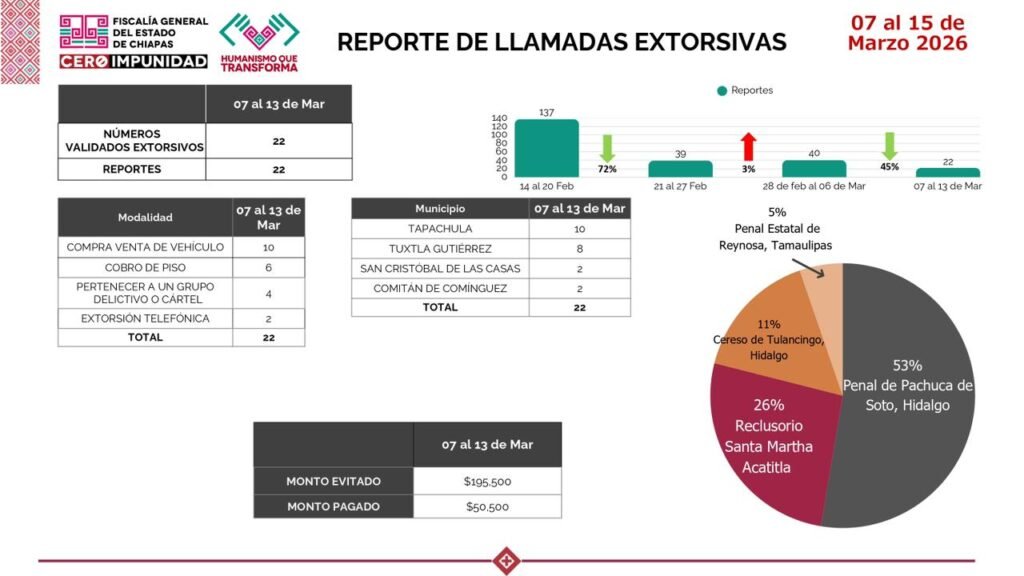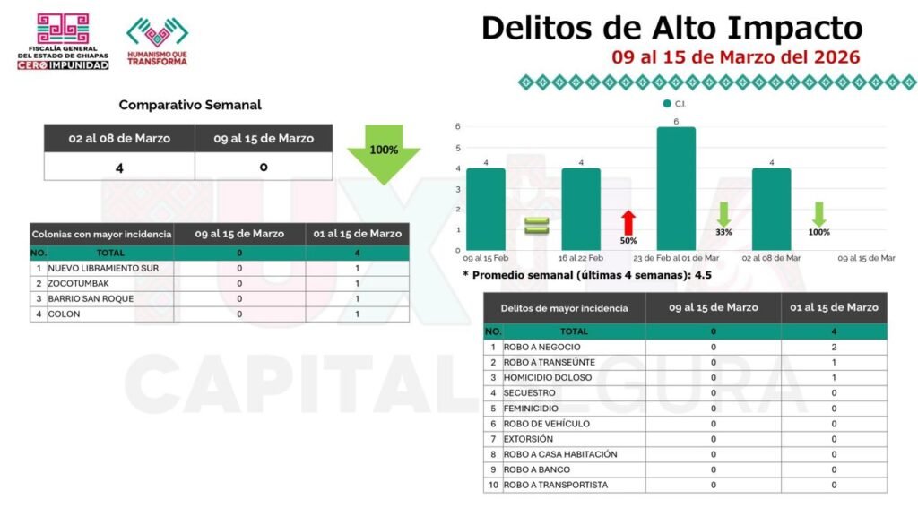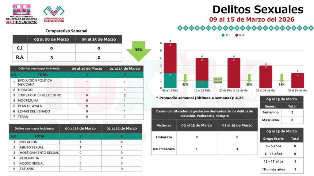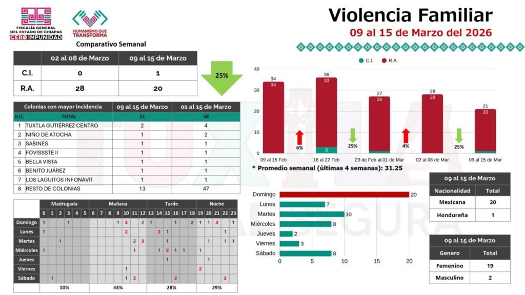 Mientras que, de la incidencia delictiva en la semana del 9 al 15 de marzo en Tuxtla Gutiérrez, Jorge Llaven detalló que en cuanto a delitos diversos se tuvieron 35 denuncias; en delitos de alto impacto no se tuvo ninguna denuncia. Respecto a los delitos de tipo sexual hubo 33% menos denuncias que la semana antepasada; y en el delito de violencia familiar se tuvieron 21 denuncias.
