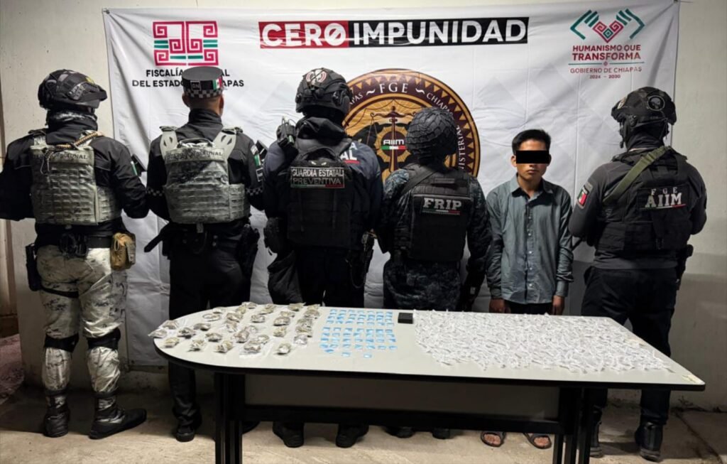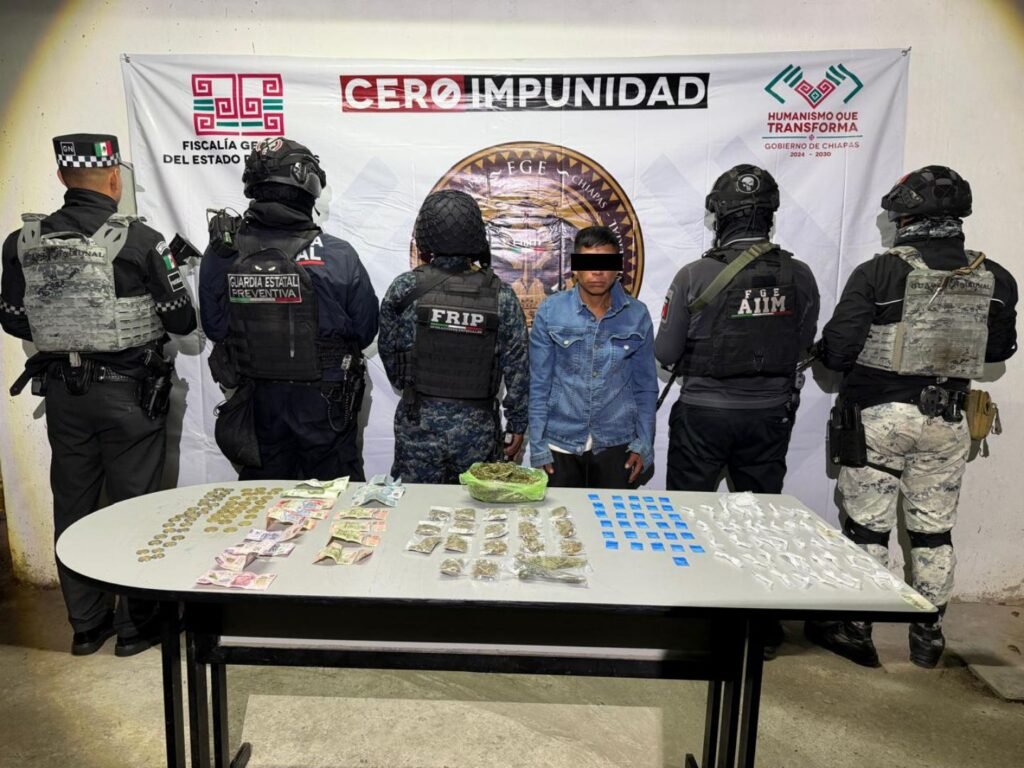 Como resultado, en el domicilio ubicado en la salida de San Juan Cancuc-Oxchuc, se detuvo a Diego “N”, a quien se le aseguraron 263 bolsitas con material sólido cristalino con las características del “cristal” y 31 bolsitas con hierba verde con las características marihuana.