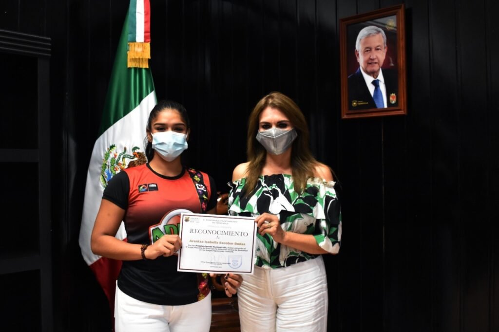 Tapachula, Chiapas.- La presidenta municipal Rosa Irene Urbina Castañeda, entregó un reconocimiento a la deportista tapachulteca Arantxa Isabella Escobar Rodas, por su destacada participación en los Juegos Nacionales Conade 2021, en donde obtuvo medalla de plata con la Selección Estatal de Basquetbol.
