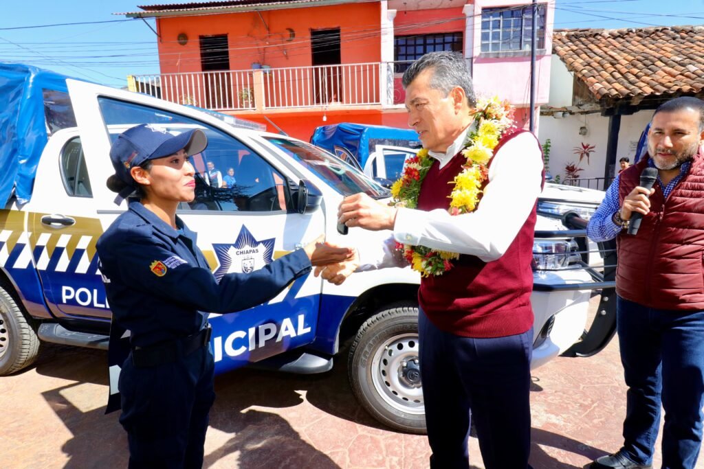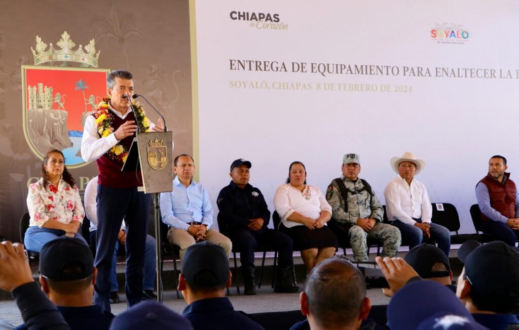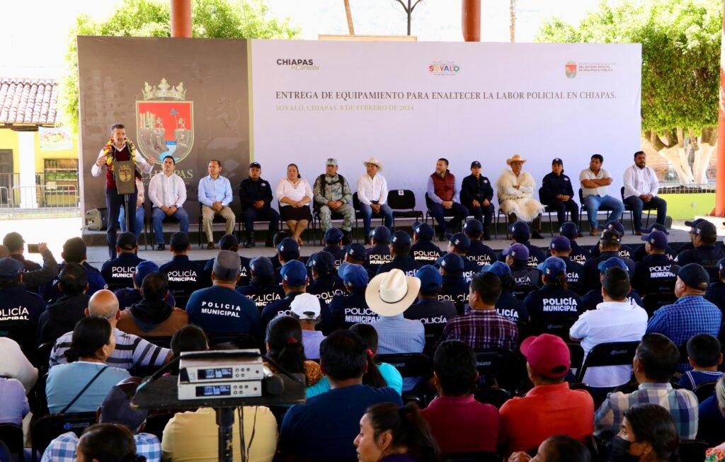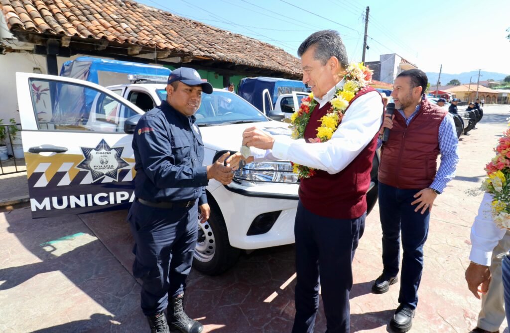 El gobernador Rutilio Escandón Cadenas entregó patrullas, motopatrullas, equipamiento y uniformes a las corporaciones policiales de los municipios de Soyaló, Ixtapa, Bochil, Jitotol, Rincón Chamula, Tapalapa, Rayón y Amatán, donde destacó que, ahora más que nunca, se invierte para que las y los policías cuenten con todas las herramientas y una mejor preparación profesional para garantizar la paz, la tranquilidad, el bienestar y el Estado de Derecho.