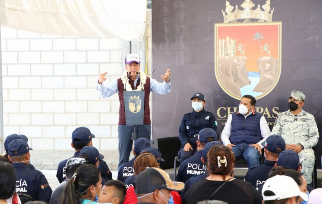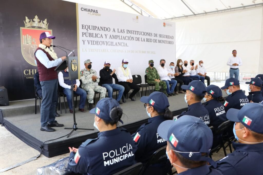Durante la entrega de kits de uniformes, equipamiento y patrullas a las corporaciones policiales de los municipios de La Trinitaria y Maravilla Tenejapa, el gobernador Rutilio Escandón Cadenas sostuvo que su gobierno trabaja alineado a las políticas nacionales en materia de seguridad que impulsa el presidente de la República, Andrés Manuel López Obrador, por eso en Chiapas hay un verdadero estado de bienestar, de paz y tranquilidad.