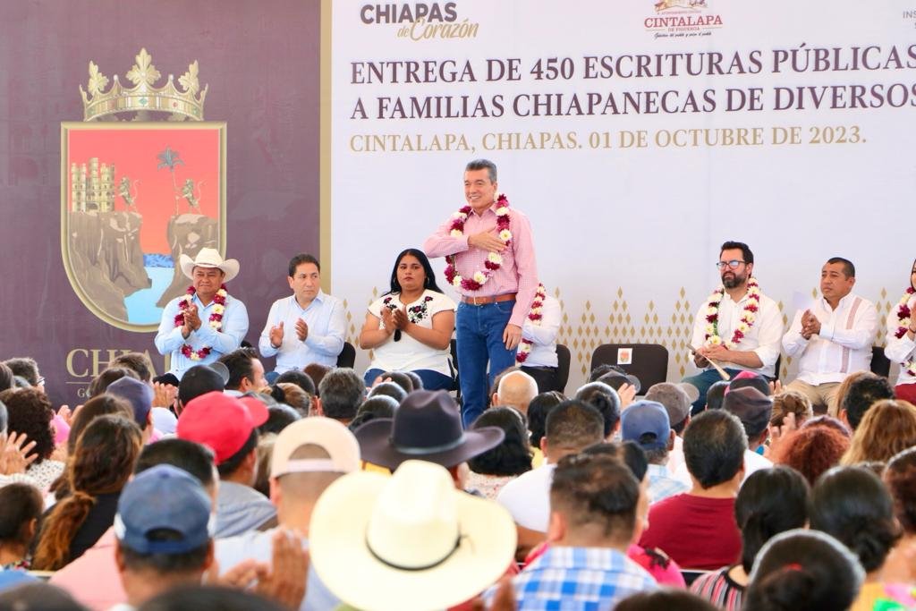 El mandatario explicó que estas acciones son necesarias para que las y los chapanecos estén más fortalecidos en su economía y vivan más tranquilos, por ello, dijo que, en colaboración con los tres órdenes de gobierno, se pasó de 249 escrituras que se entregaron en el sexenio anterior, a 5 mil 600 en lo que va de la actual administración estatal, además, se han regularizado 12 mil lotes agrarios y pronto se entregarán otros mil 500 certificados.