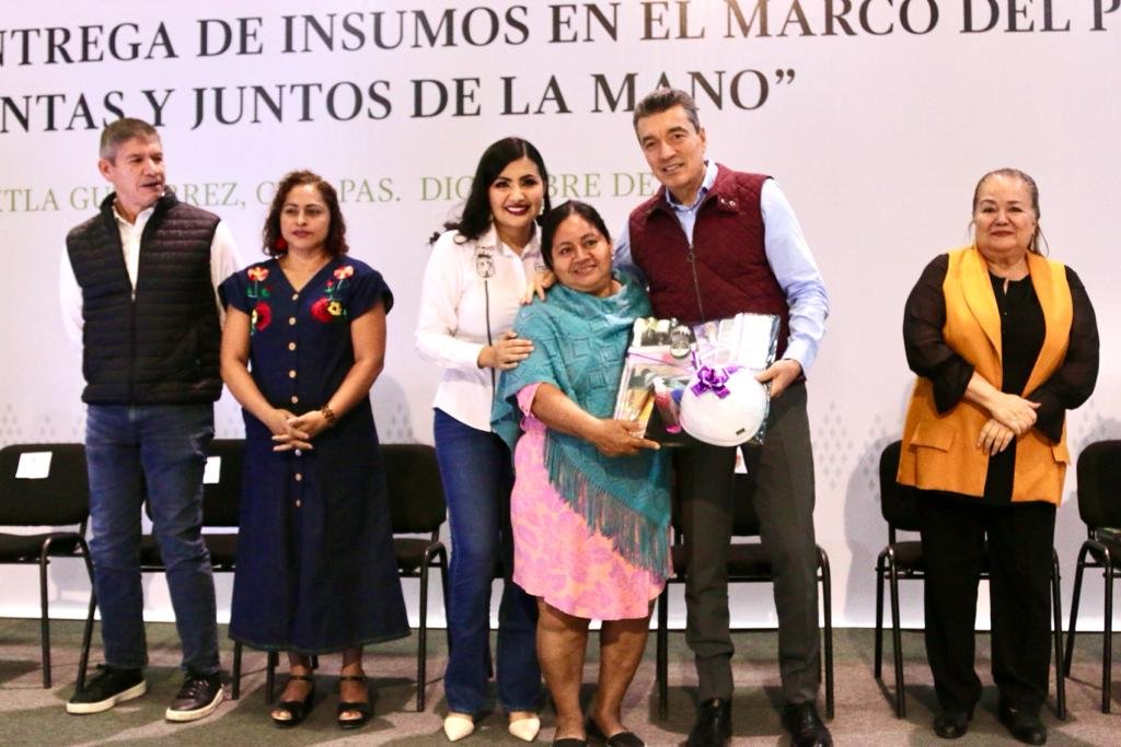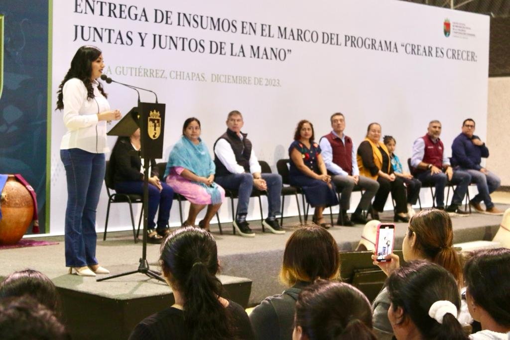 El gobernador Rutilio Escandón Cadenas realizó la entrega de insumos de los programas Crear es crecer, juntas y juntos de la mano; Escuela con Valores y Ocupando mi Comunidad, en Tuxtla Gutiérrez, donde resaltó que se continuará invirtiendo en este tipo de apoyos que impulsan el autoempleo, la construcción de espacios seguros y las redes de apoyo en las colonias.