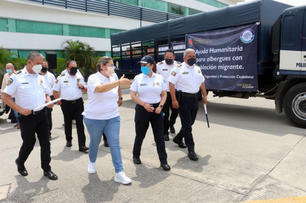 Tuxtla Gutiérrez, Chiapas.- La secretaria de Seguridad y Protección Ciudadana, Gabriela Zepeda Soto, encabezó el banderazo de salida de ayuda humanitaria a población migrante, donada por personal de esta institución de seguridad, acto en el cual refrendó el compromiso de fortalecer los trabajos de colaboración y cooperación para la atención de grupos en situación de vulnerabilidad en Chiapas.