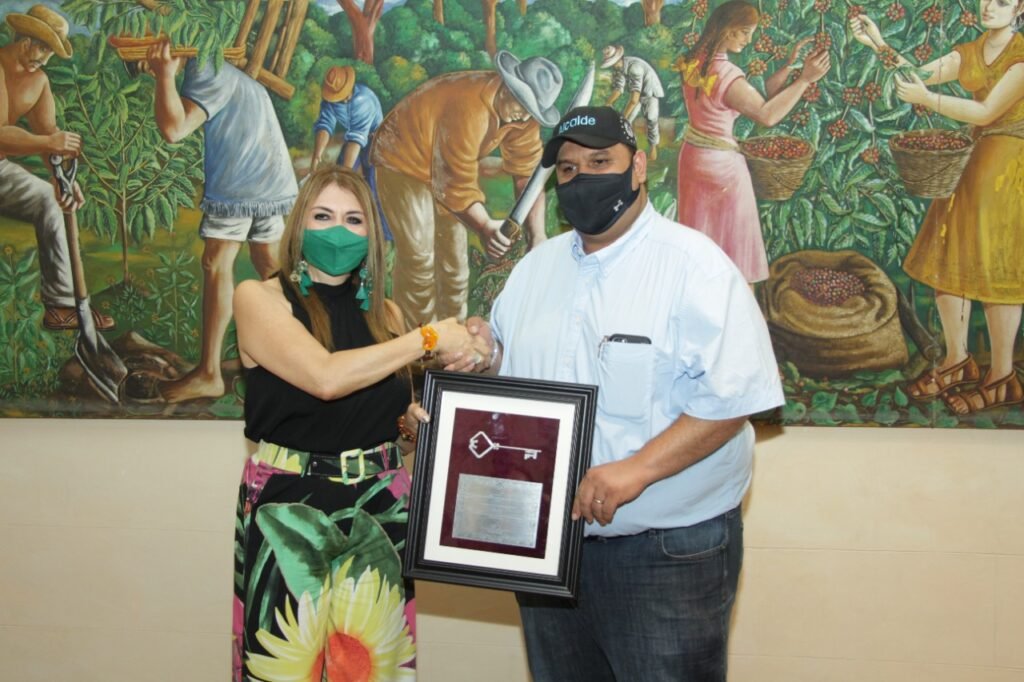 Tapachula, Chiapas.- En el marco de la declaración de Ciudades Hermanas entre Tapachula, Chiapas y Santa Ana, El Salvador, la presidenta municipal Rosa Irene Urbina Castañeda hizo entrega de las Llaves de la Ciudad a su homólogo, Gustavo Acevedo Berganza.