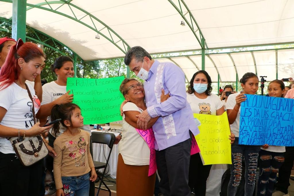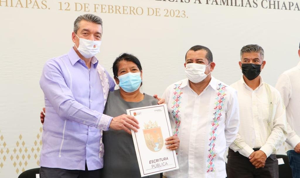 El director general de la Promotora de Vivienda Chiapas (Provich), Freddy Escobar Sánchez, informó que siguiendo las indicaciones del mandatario estatal y tras el trabajo conjunto con los Ayuntamientos de la región, tras muchos años de espera 100 familias recibieron de las manos del gobernador las escrituras públicas que dan certeza jurídica de su vivienda o propiedad. Refrendó su compromiso de seguir impulsando acciones para que más familias regresen a sus casas con la seguridad de que nadie les pueda despojar de su patrimonio.