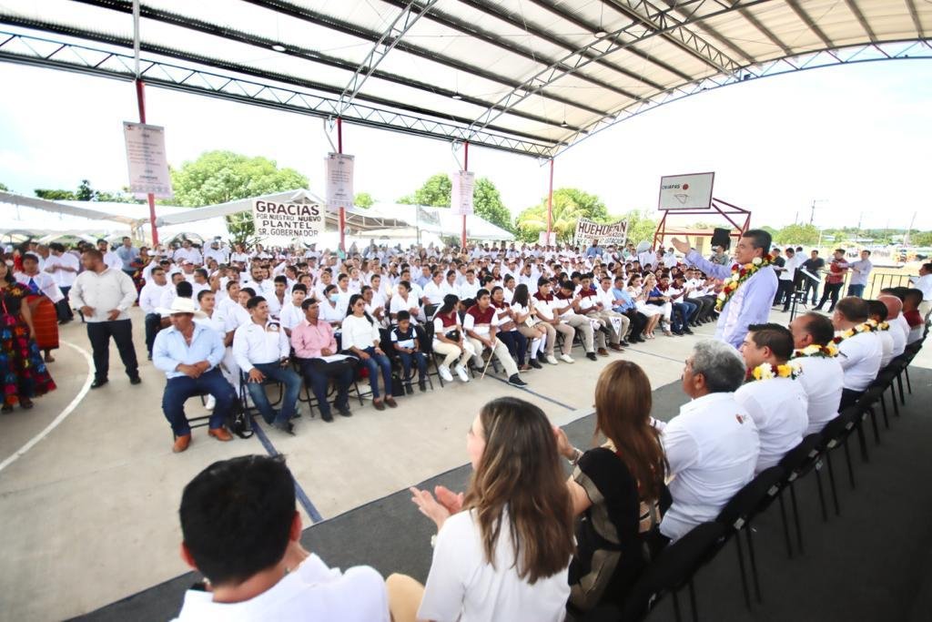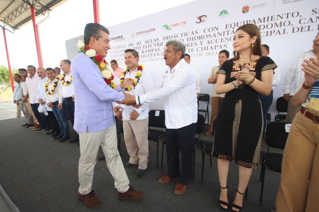El gobernador Rutilio Escandón Cadenas inauguró la construcción de infraestructura física educativa en el Plantel número 47 Estación Huehuetán del Centro de Estudios Científicos y Tecnológicos del Estado de Chiapas (CECyTE Chiapas), en el municipio de Huehuetán, obra a la que se destinó una inversión superior a los 8.4 millones de pesos, para brindar espacios más seguros y dignos a la comunidad estudiantil de las carreras de Programación y Sistema de Producción Agrícola.