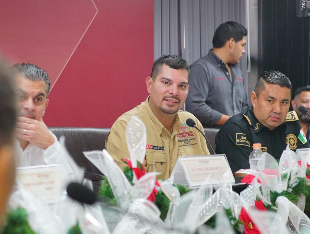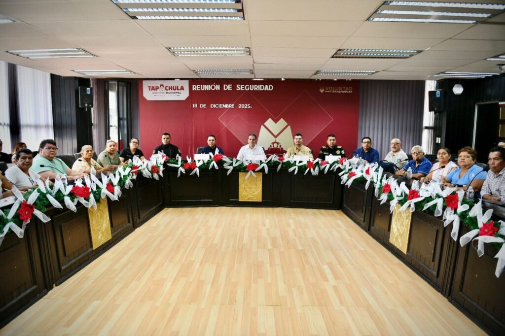 Tuxtla Gutiérrez, Chiapas, 18 de Diciembre de 2025.- El secretario de Seguridad del Pueblo, Óscar Alberto Aparicio Avendaño, se reunió con representantes de 18 colonias en la Sala de Cabildo del Honorable Ayuntamiento de Tapachula, para fortalecer los canales de comunicación y las estrategias en materia de prevención y combate de delitos.