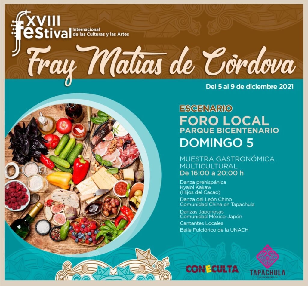 A su vez en el parque Bicentenario desde las 16:00 horas se realizará una Muestra Gastronómica Multicultural, en el que se incluye danzas prehispánica Kyajol Kakaw (Hijos del Cacao), del León Chino, Japonesas, cantantes locales y bailes folklóricos de la UNACH.