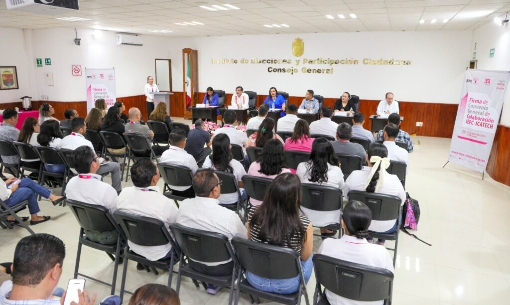 El Instituto de Elecciones y Participación Ciudadana de Chiapas (IEPC) y el Instituto de Capacitación y Vinculación Tecnológica del Estado de Chiapas (Icatech), firmaron la mañana de este lunes, un convenio general de colaboración con la finalidad de establecer los procesos para llevar a cabo acciones tendientes al mejor aprovechamiento de recursos, coordinando esfuerzos con el propósito de establecer diversos programas de capacitación en beneficio del personal del Servicio Profesional Electoral Nacional y de la Rama Administrativa, para una mejor competitividad laboral.