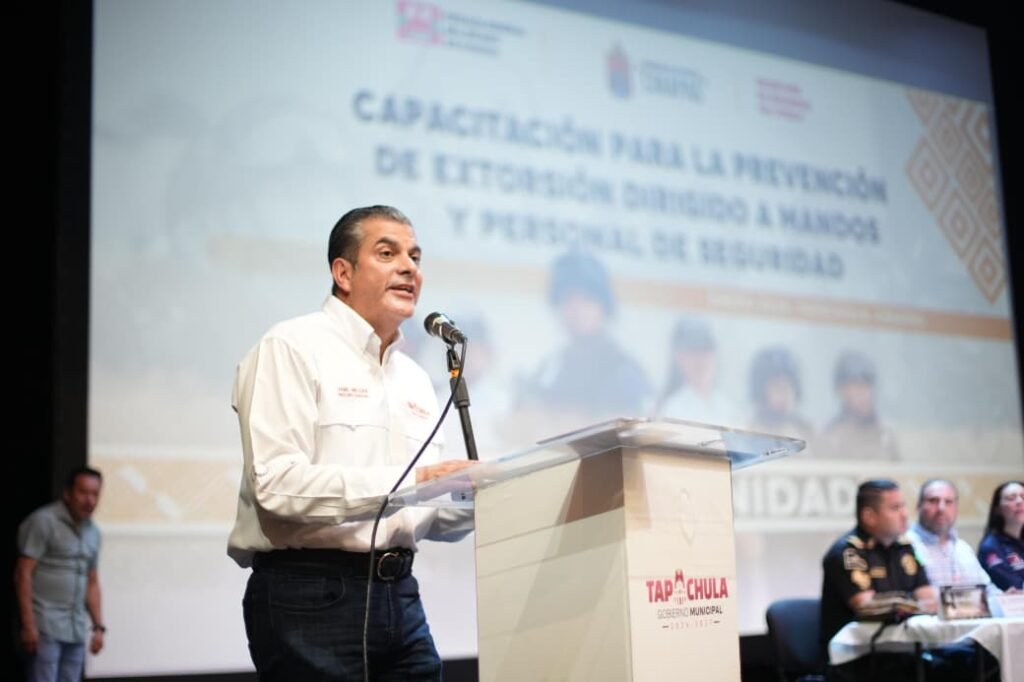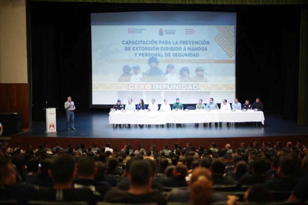 En el municipio de Tapachula, el Fiscal General del Estado, Jorge Luis Llaven Abarca, encabezó la Capacitación para la Prevención del Delito de Extorsión, con el objetivo de fortalecer las capacidades de mandos y personal de seguridad ante este delito que se presenta en distintas modalidades. Lo anterior, como parte de la estrategia de combate que impulsan la Presidenta Claudia Sheinbaum Pardo y el Gobernador Eduardo Ramírez Aguilar.