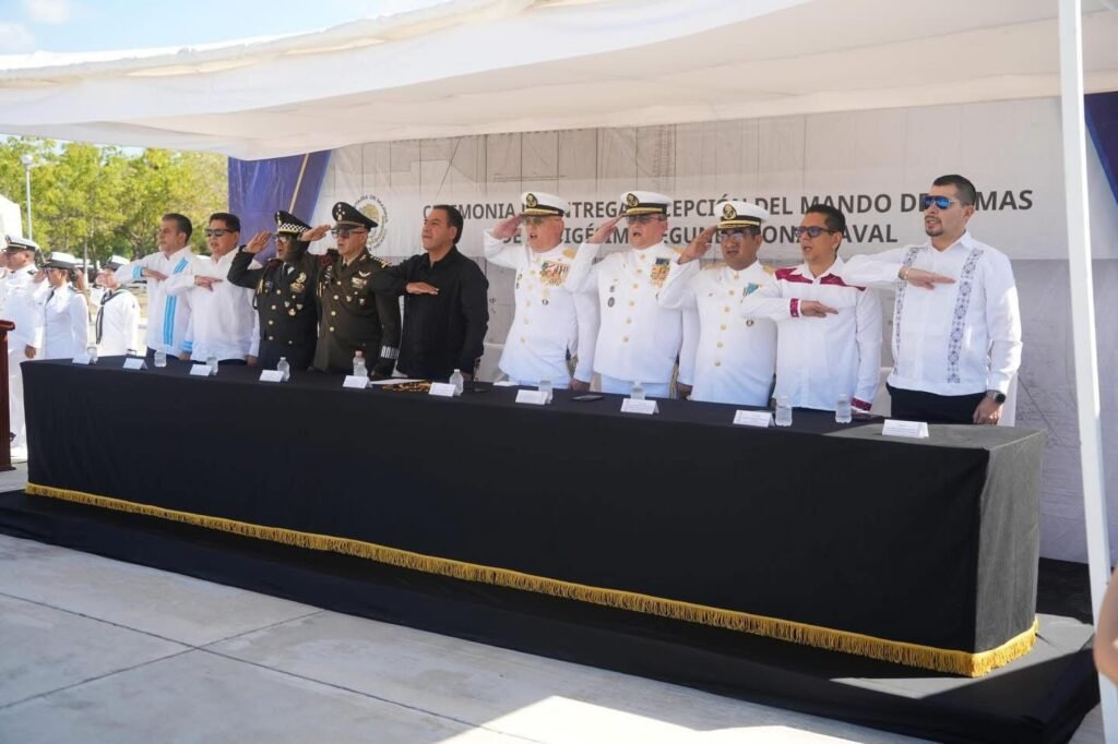 Tapachula, Chiapas; 16 de enero de 2026.- El secretario de Seguridad del Pueblo, Óscar Alberto Aparicio Avendaño, participó en los actos protocolarios realizados con motivo de la entrega recepción de mando de armas de la XXII Zona Naval, donde el Vicealmirante Miguel Ángel Núñez de la Huerta, asumió como Comandante de la XXII Zona Naval, reafirmando la unidad, el respeto y la confianza entre las instituciones de seguridad.