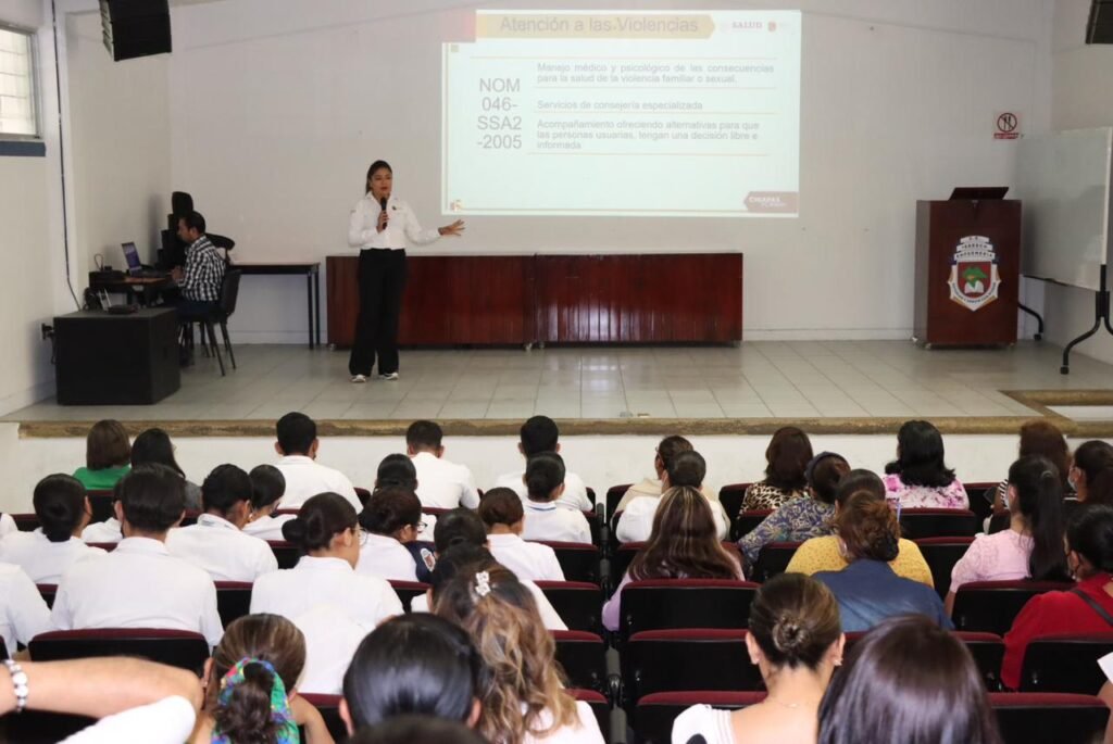 Tuxtla Gutiérrez, Chiapas; 26 de mayo de 2023.- Con el objetivo de fortalecer la red de servicios de salud respecto a la aplicación de la Norma Oficial Mexicana NOM-046-SSA2-2005 Violencia familiar, sexual y contra las mujeres, la Secretaría de Salud del estado, en colaboración con la organización no gubernamental Médicos del Mundo Suiza, inició un ciclo de capacitación sobre esta normatividad dirigido al personal de salud de las diferentes instituciones del sector.