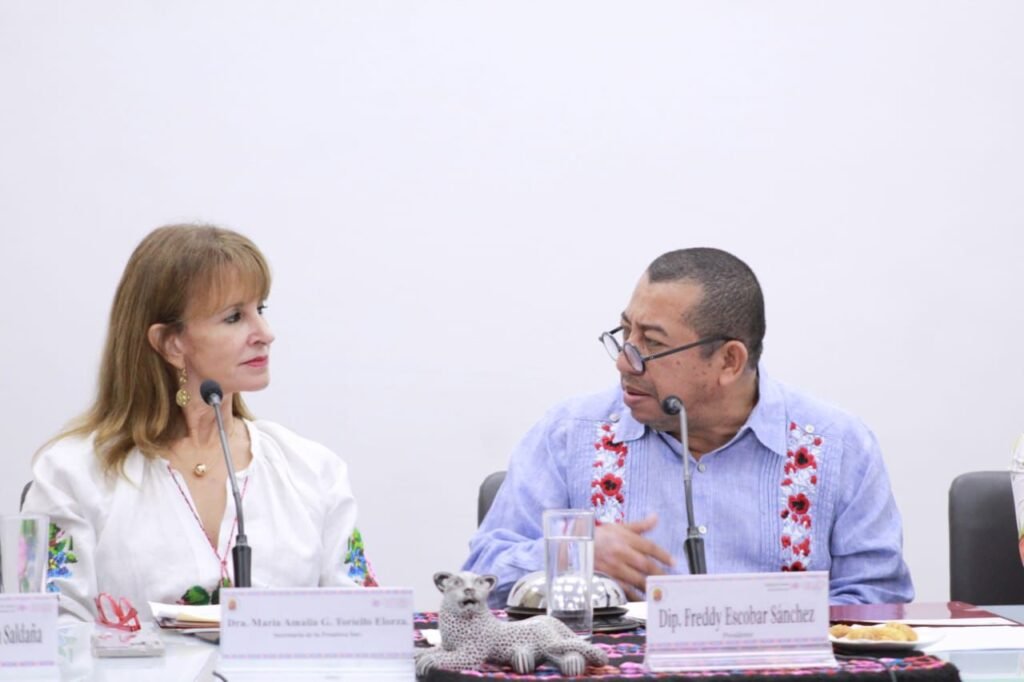 Tuxtla Gutiérrez, Chiapas; 19 de diciembre de 2025.- María Amalia Toriello Elorza, secretaria de la Frontera Sur, compareció ante la Comisión de Asuntos de la Frontera Sur, que preside el diputado Freddy Escobar Sánchez, para ampliar la glosa del Primer Informe de Gobierno.