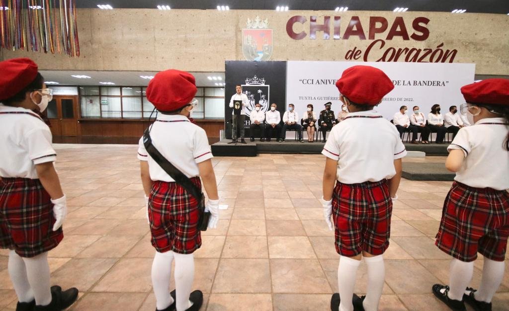 Por eso, el gobernador invitó a la niñez y a la juventud de Chiapas a mantener la estafeta en el cariño, afecto y reconocimiento del amor a la patria, a través de este símbolo patrio que ondea de manera impetuosa en todo el territorio nacional; ese amor que cuando se está fuera del país y se ve la presencia a través de los tres colores de la bandera, es motivo de inspiración para seguir adelante.