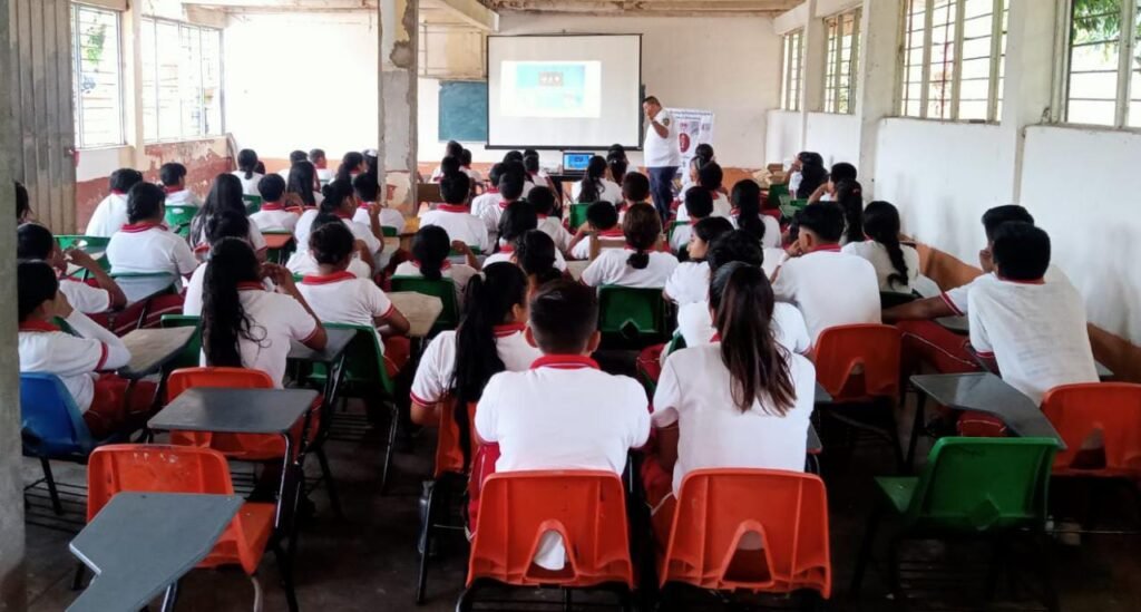 Tuxtla Chico, Chiapas a 07 de marzo de 2023. Estudiantes de la Telesecundaria 499 ´Belisario Domínguez Palencia´ del Ejido Silvano Gatica en Tuxtla Chico, recibieron este martes una plática informativa con el tema: “prevención de accidentes con educación vial y cuáles son los números de emergencia”.