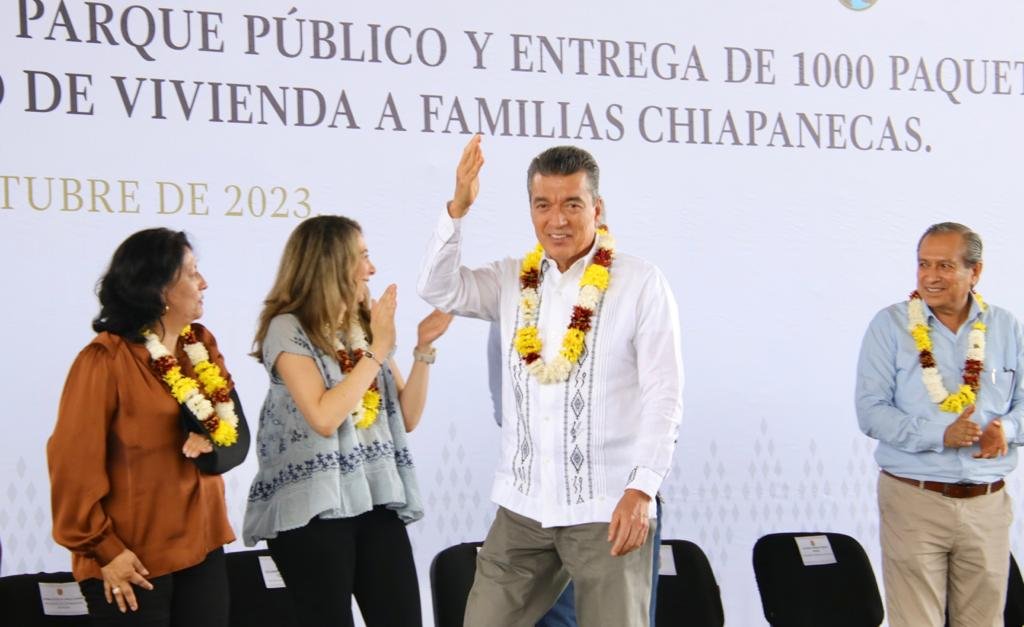 El gobernador Rutilio Escandón Cadenas inauguró la remodelación del Parque Central de Acala, donde entregó mil paquetes de apoyo para mejoramiento de vivienda a familias, y destacó el crecimiento que ha tenido el municipio, el cual, aseguró, es habitado por gente trabajadora y responsable.