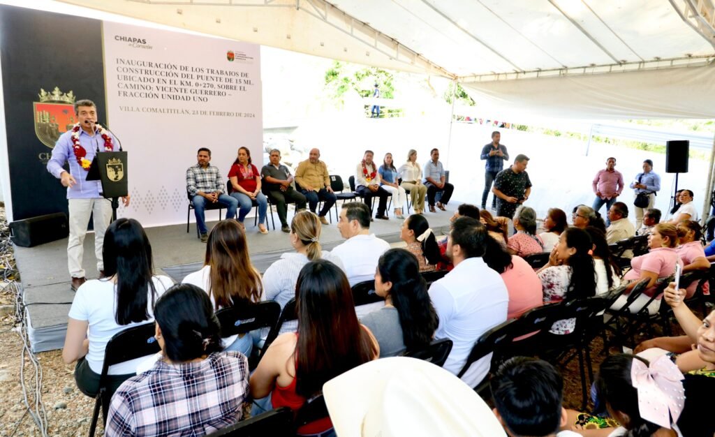 En la inauguración de los trabajos de construcción del puente vehicular ubicado en el kilómetro 0+270 sobre el camino Vicente Guerrero-Fracción Unidad Uno, en el municipio de Villa Comaltitlán, el gobernador Rutilio Escandón Cadenas destacó que esta obra fortalece la seguridad vial, la conectividad regional y las actividades sociales, económicas y comerciales en la Región Soconusco.