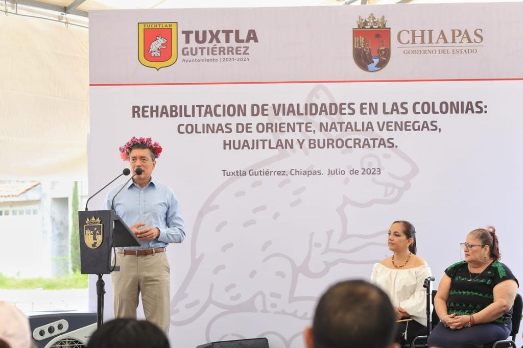 Al inaugurar la pavimentación y rehabilitación de vialidades en las colonias Colinas del Oriente, Natalia Venegas, Huajintlán y Burócratas, de Tuxtla Gutiérrez, el gobernador Rutilio Escandón Cadenas destacó que, ahora más que nunca, los Gobiernos Estatal y Municipal hacen causa común para consolidar este tipo de obras prioritarias, que además de abonar al bienestar de la población, fortalecen la seguridad y la movilidad, y contribuyen al mejoramiento de la imagen urbana de la ciudad capital.