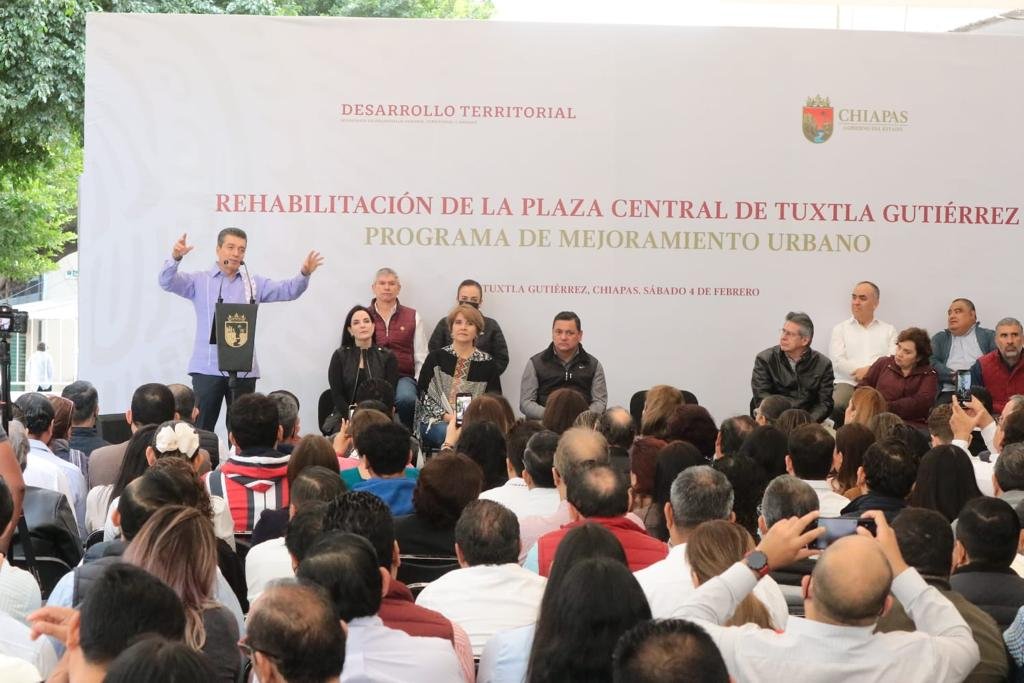 Durante la inauguración de la renovación del Parque Central y del mejoramiento integral de la imagen urbana del Centro Histórico de Tuxtla Gutiérrez, el gobernador Rutilio Escandón Cadenas destacó que con el respaldo del presidente de la República, Andrés Manuel López Obrador, en Chiapas se han consolidado grandes acciones de recuperación de espacios públicos y la construcción de obras prioritarias, que abonan al bienestar, la paz, la seguridad, la salud y al fortalecimiento del tejido social.