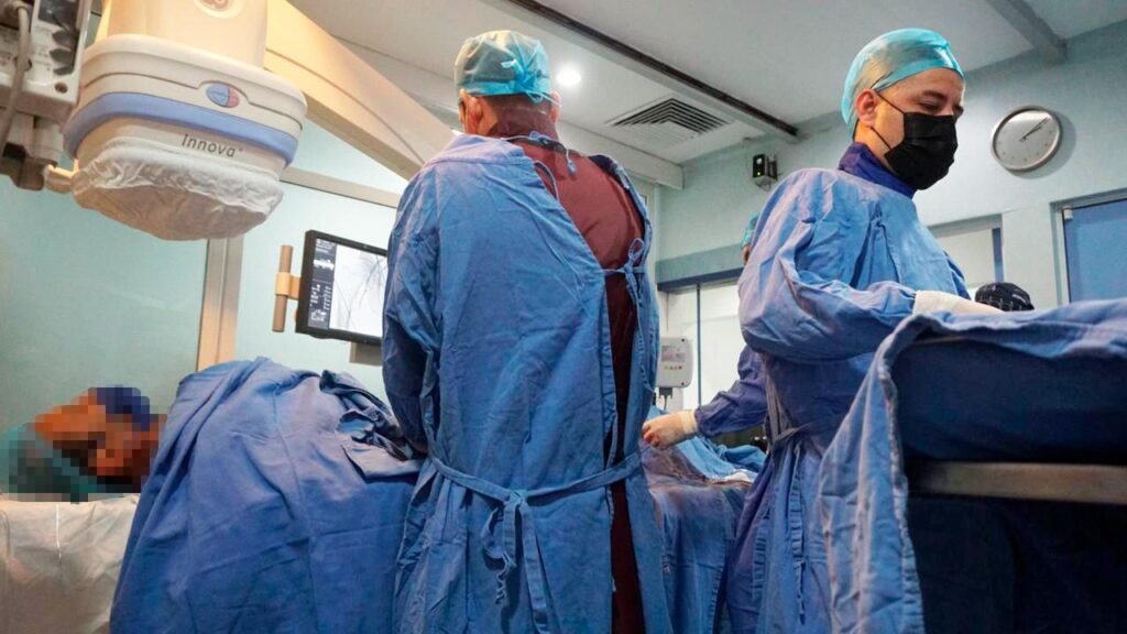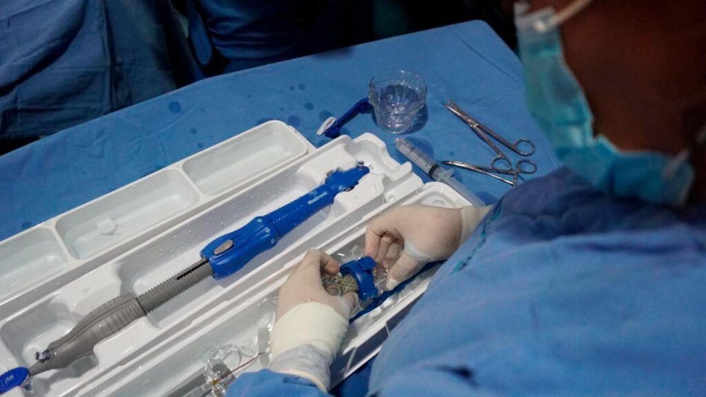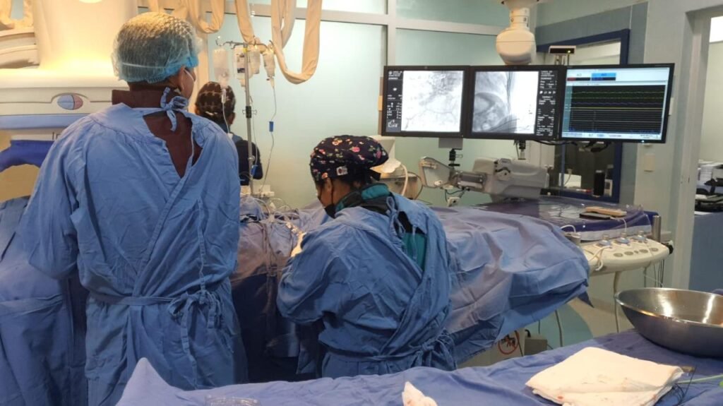 Expuso que la operación consiste en un pequeño corte en la pierna derecha del paciente, donde se introduce un interruptor para colocar la válvula, sin necesidad de cirugía del tórax ni anestesia general y sin intubación.