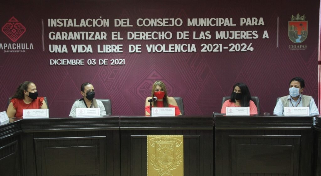El Consejo Municipal para Garantizar el Derecho de las Mujeres a una Vida Libre de Violencia 2021-2024, lo preside la alcaldesa de Tapachula, Rosa Irene Urbina Castañeda y entre otras dependencias, participan el Distrito de Salud VII, la Fiscalía Regional, el Centro de Justicia para la Mujer en Tapachula, el Sistema para el Desarrollo Integral de la Familia, la Comisión Estatal de Derechos Humanos y la organización Por la Superación de la Mujer.