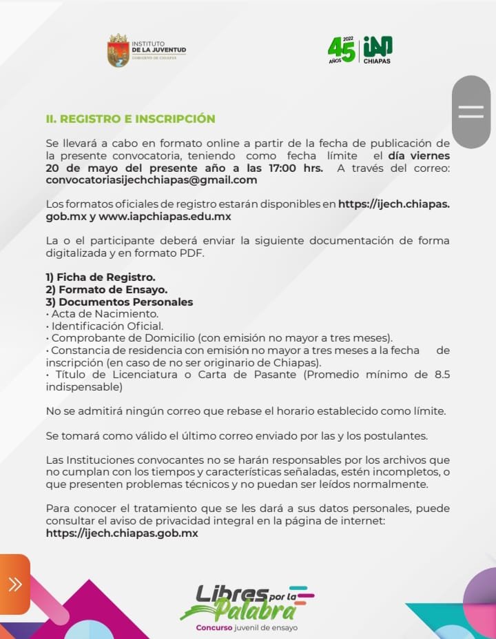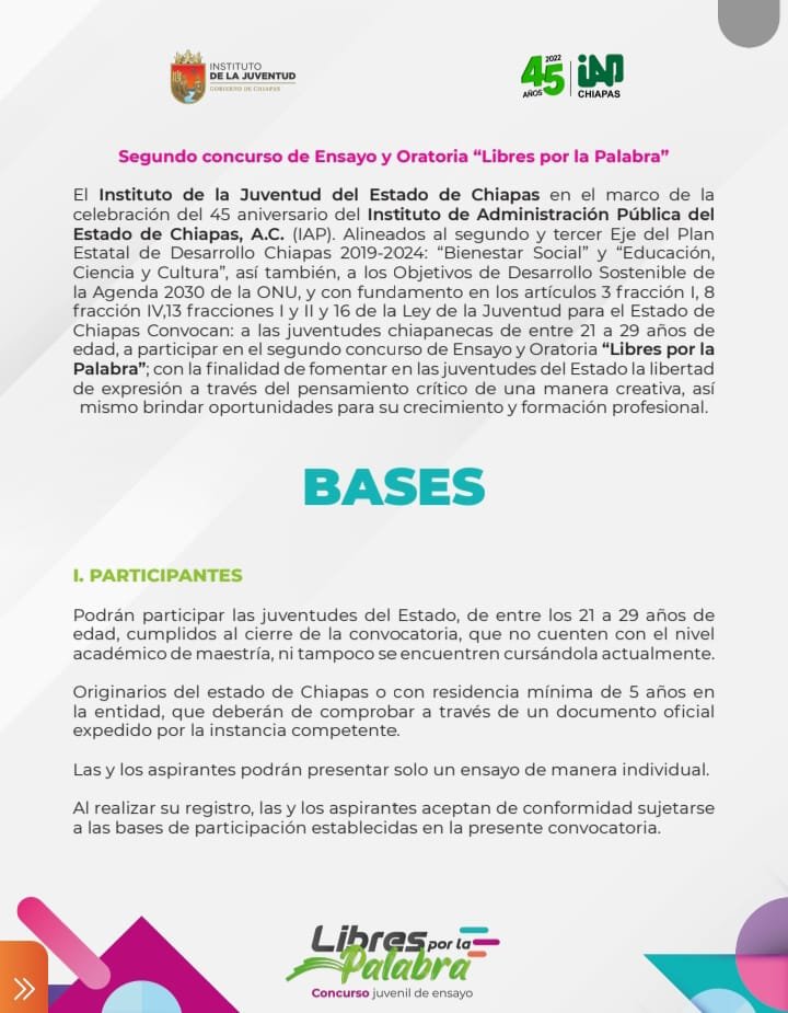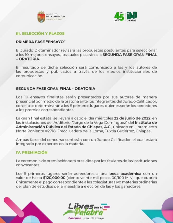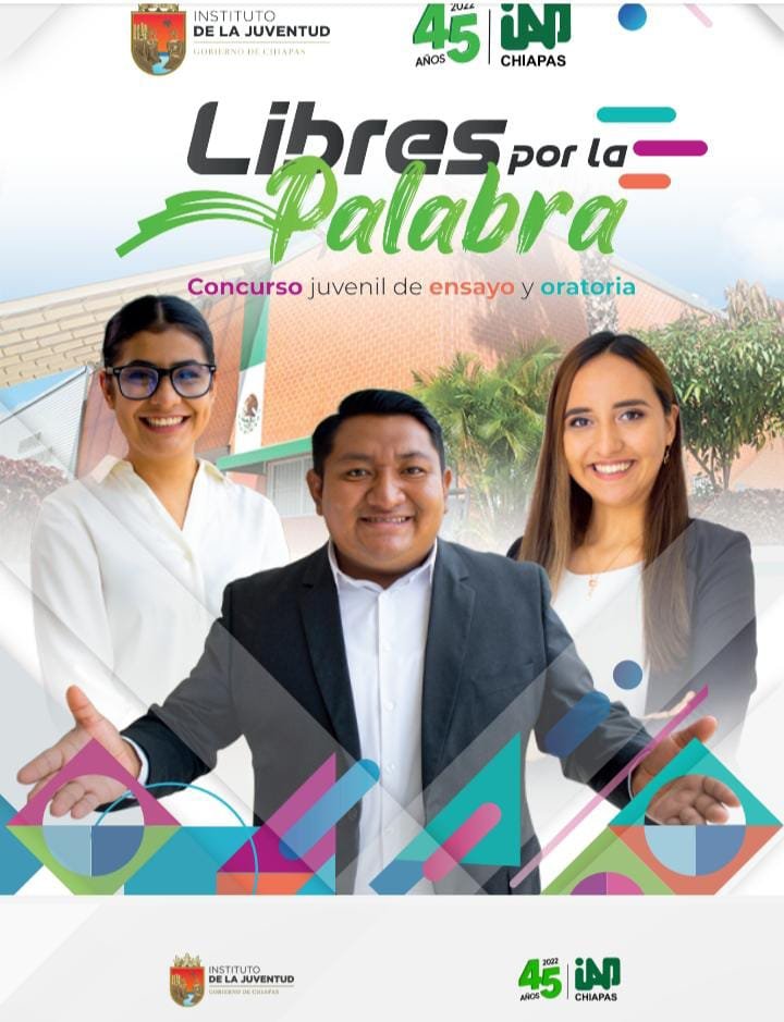 Tuxtla Chico, Chiapas a 17 de mayo de 2022. El Ayuntamiento de Tuxtla Chico invita a los jóvenes al segundo concurso de ensayo y oratoria “Libres por la palabra” organizado por el Instituto de la Juventud del Estado de Chiapas en el marco de la celebración del 45 aniversario del Instituto de Administración Pública del Estado de Chiapas, A.C. (IAP).